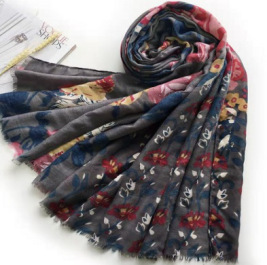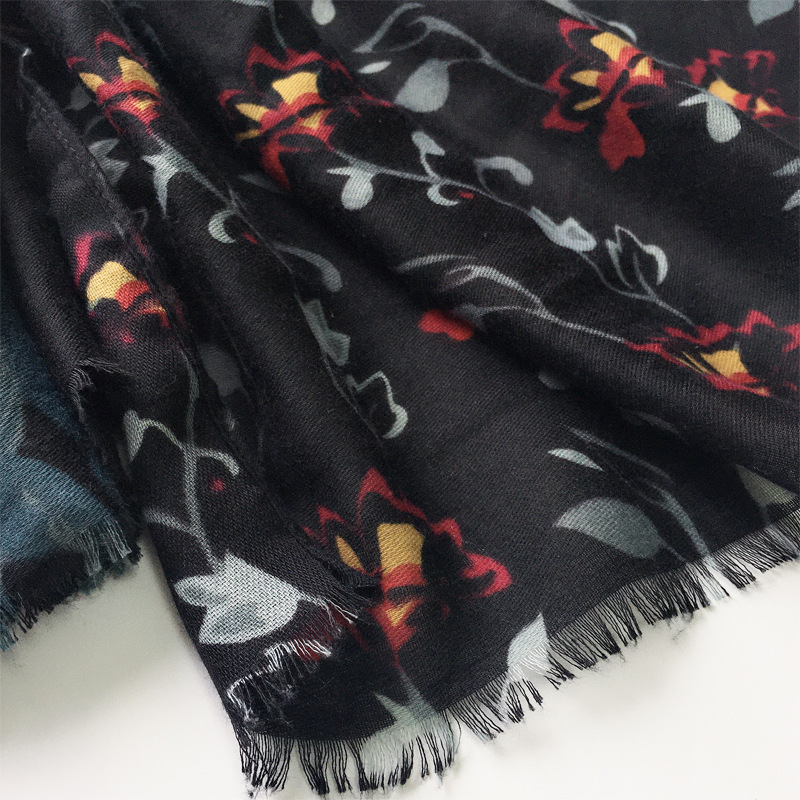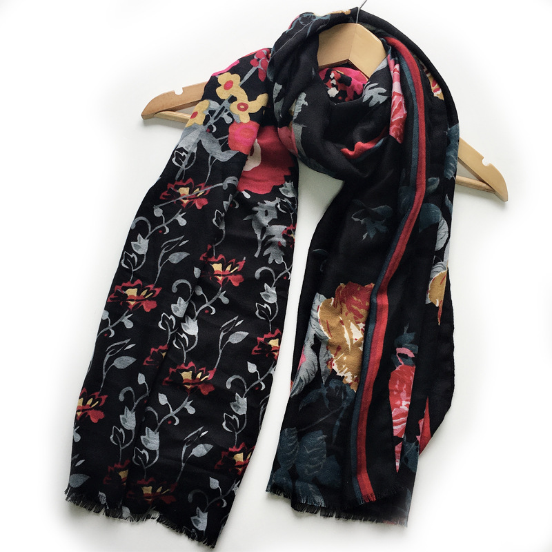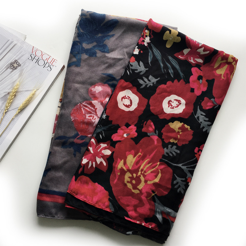 棉麻围巾32支缎纹围巾花卉花朵印花围巾厂家现货长款流穗围巾批发