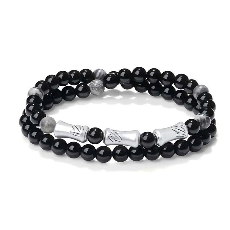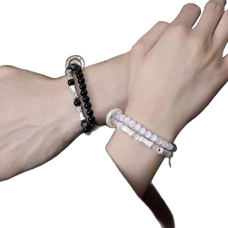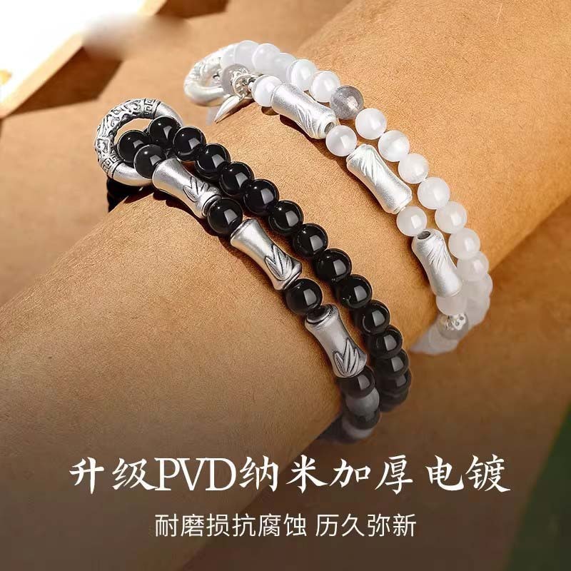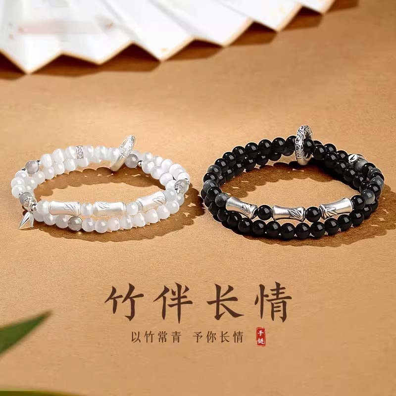 999纯银竹节情侣手链一对黑曜石国风手串男女款生日礼物送男女友
