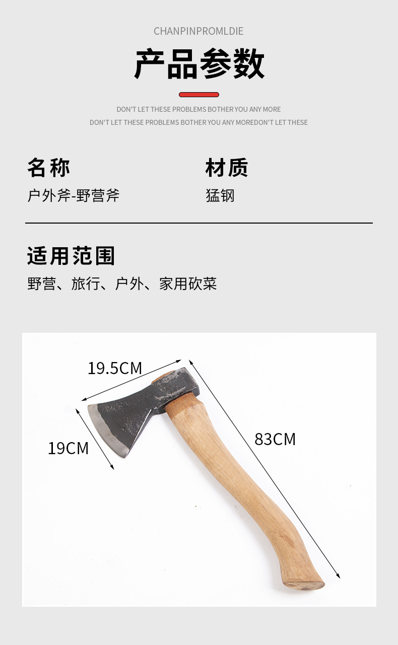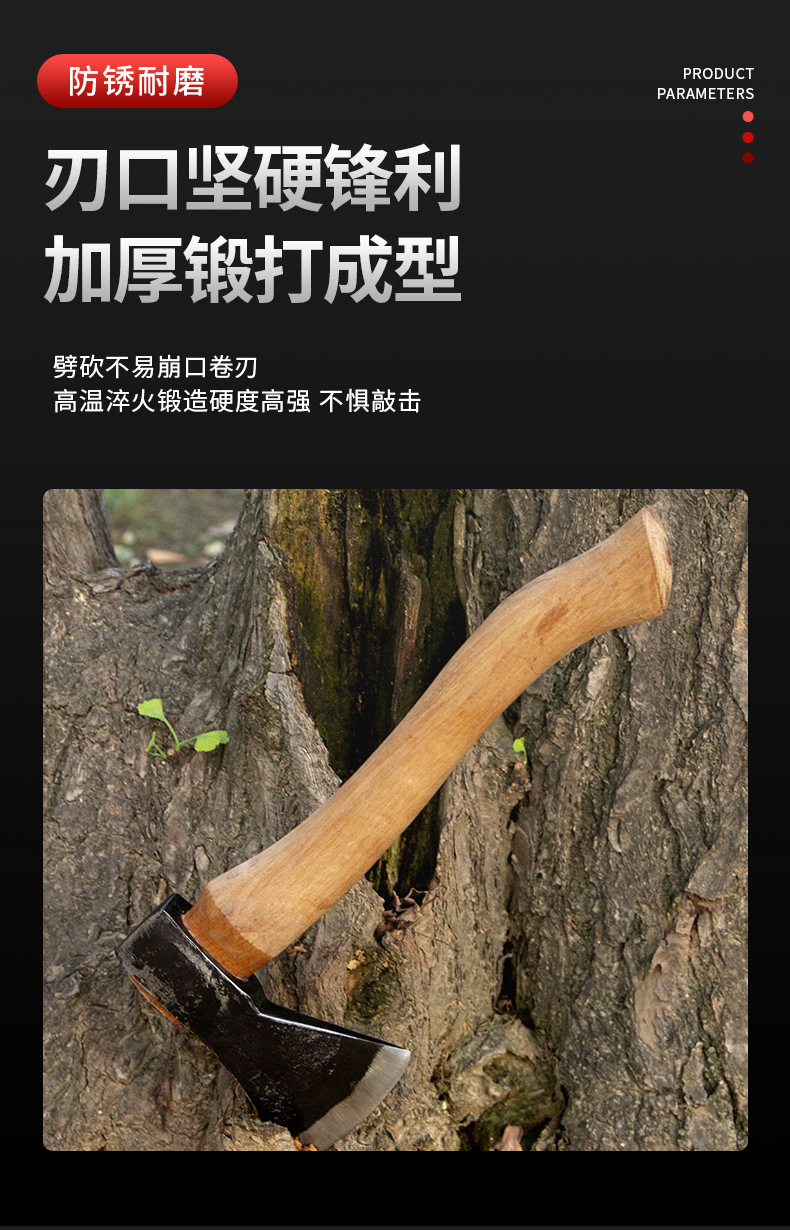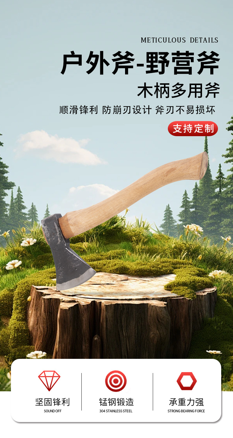 产地: 山东 是否进口: 否 订货号: 经典款户外斧-野营斧 品牌: 其他 型号: 1 货号: 经典款户外斧-野营斧 类型: 多用斧 加工定制: 是 材质: 锰钢 用途: 伐木 刀口形状: 弧形 全长: 365 刃宽: 105 斧顶尺寸: 咨询 斧孔尺寸: 咨询 柄长: 36.5cm 硬度: 60 手柄材质: 青冈木 刃长: 15cm 斧类型: 野营斧