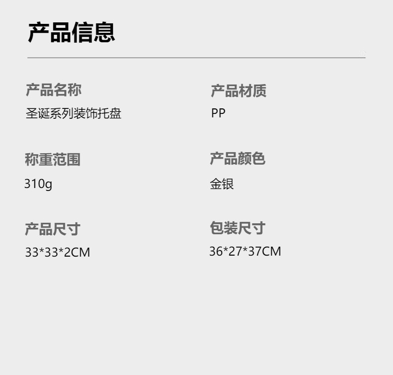 材质: 塑料 品牌: 沃居 产品质量等级: 优等品 产品类别: 果盘 风格: 美式 是否进口: 否 颜色: 金色,银色 产品上市时间: 2024年3月 是否有专利: 无 货号: 咨询卖家 规格: 直径33cm 主要销售地区: 非洲,南美,北美,中东,其他 有可授权的自有品牌: 是 是否跨境出口专供货源: 是 版权: 无 风格类型: 轻奢复古 重量: 0.261 kg/片