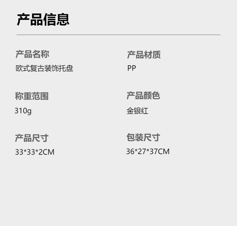 材质: 塑料 品牌: 沃居 产品质量等级: 优等品 产品类别: 果盘 风格: 美式 是否进口: 否 颜色: 金色,红色,银色 产品上市时间: 2024年3月 是否有专利: 无 货号: 咨询卖家 规格: 直径33cm 主要销售地区: 非洲,南美,北美,中东,其他 有可授权的自有品牌: 是 是否跨境出口专供货源: 是 版权: 无 风格类型: 轻奢复古 重量: 0.235 kg/片