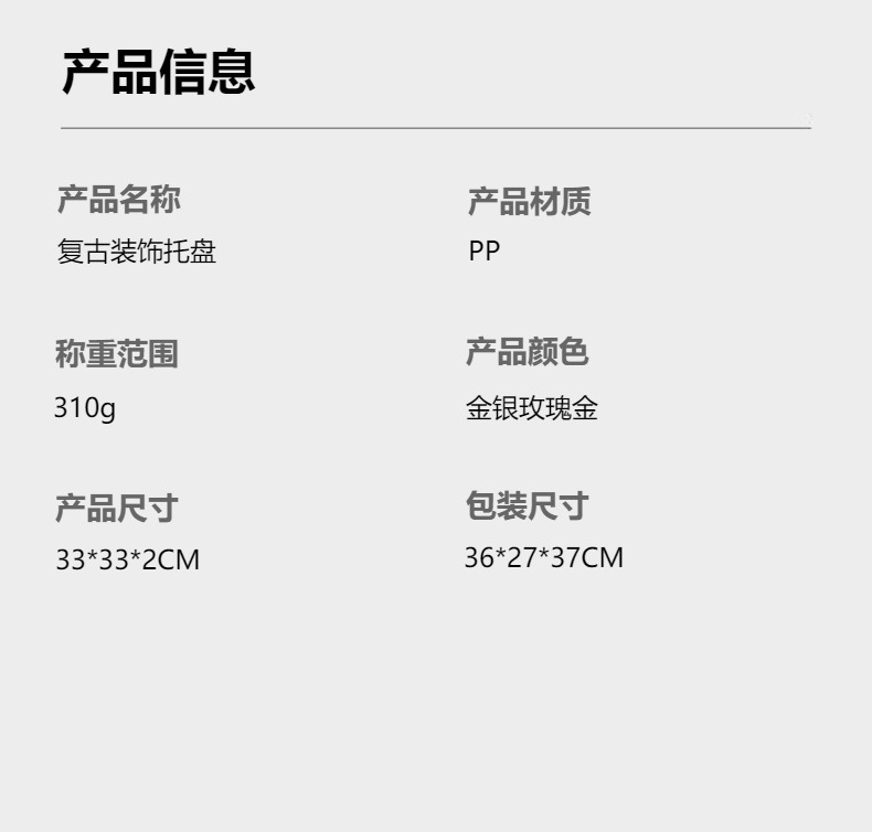 材质: 塑料 品牌: 沃居 产品质量等级: 优等品 产品类别: 果盘 风格: 美式 是否进口: 否 颜色: 金色,银色,玫瑰金 产品上市时间: 2024年3月 是否有专利: 无 货号: 咨询卖家 规格: 直径33cm 主要销售地区: 非洲,南美,北美,中东,其他 有可授权的自有品牌: 是 是否跨境出口专供货源: 是 版权: 无 风格类型: 轻奢复古 重量: 0.317 kg/片