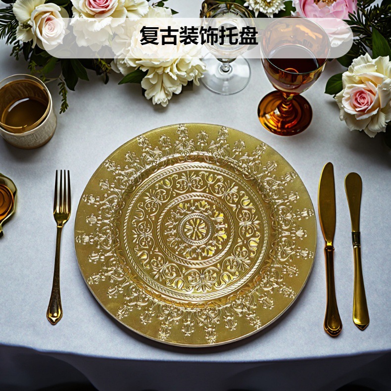 工厂直销美式复古外贸婚礼酒店派对工艺盘装饰塑料盘charger plat