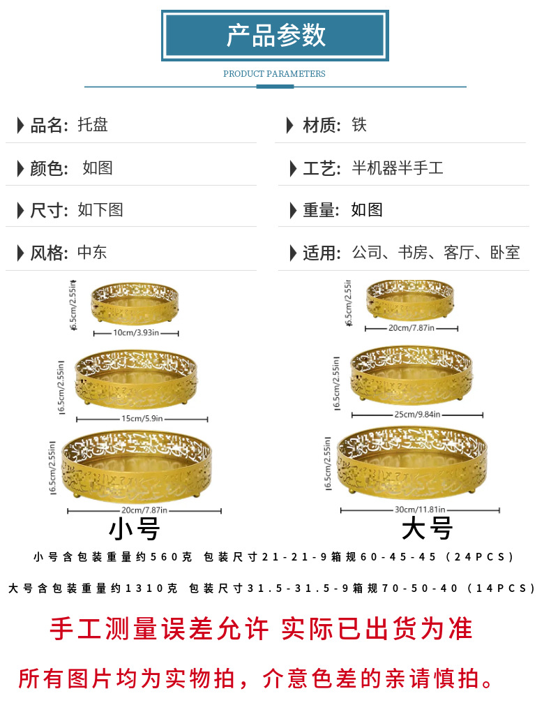 材质: 金属 类别: 托盘 品牌: YFNT 风格: 中东 包装: 纸盒包装 货号: 1008 是否专利货源: 否 颜色: 阿文三件套小号,阿文三件套大号 是否属于礼品: 否 重量: 0.259 kg/套