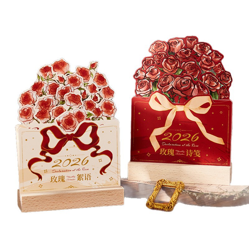2026玫瑰立体台历浪漫木质桌面日历摆件创意礼物伴手礼月历浪漫