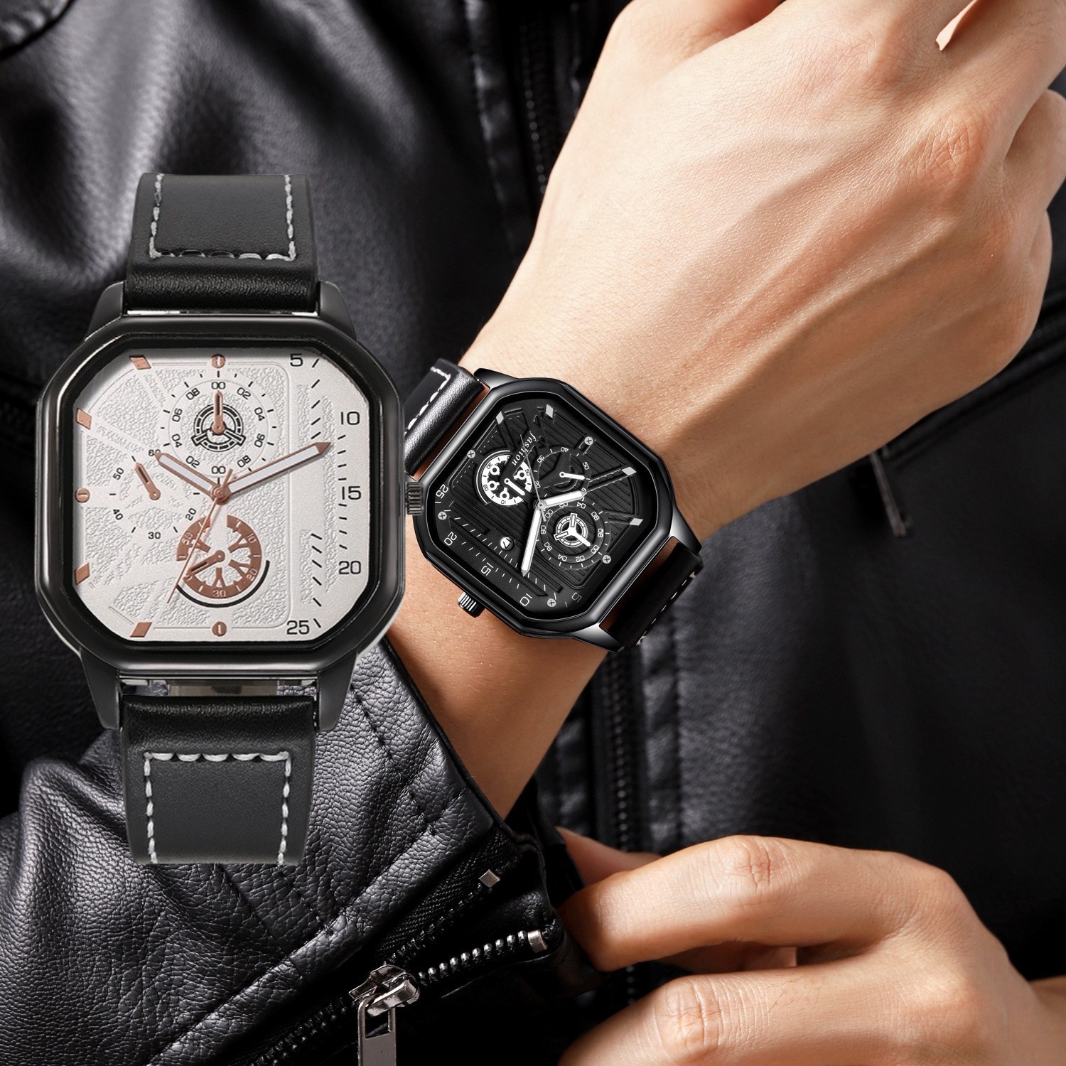 跨境大表盘时尚新款双层面方壳皮带休闲男士运动个性石英手表现货