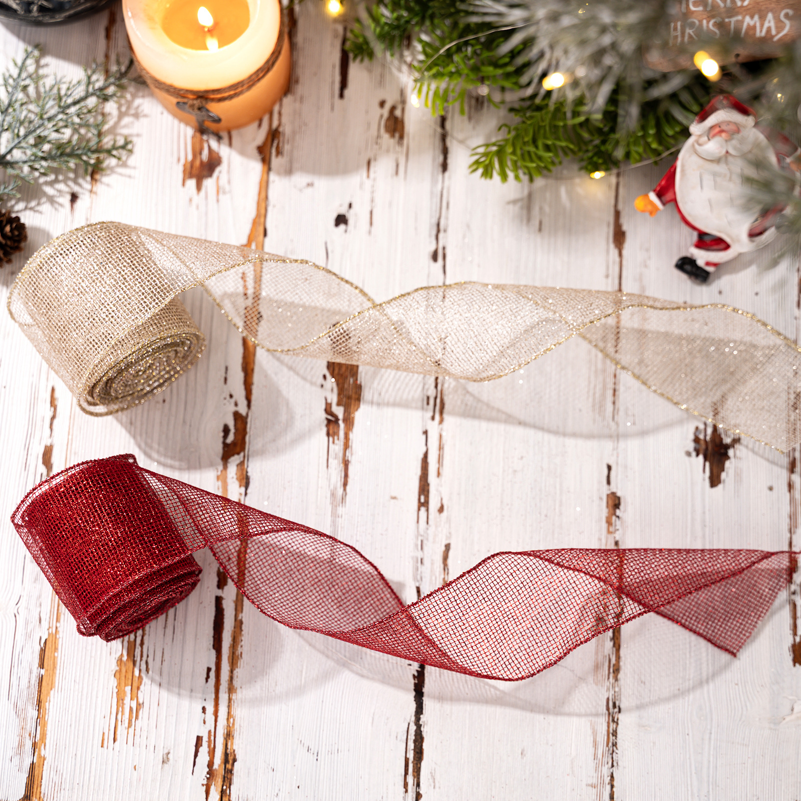 豪贝跨境圣诞树织带卷diy装饰蝴蝶结缎带红色网纱丝带 礼物盒装饰