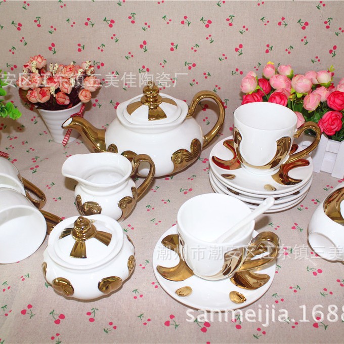 欧式描金陶瓷电镀咖啡杯碟壶15头骨瓷咖啡茶具咖啡具礼盒包装