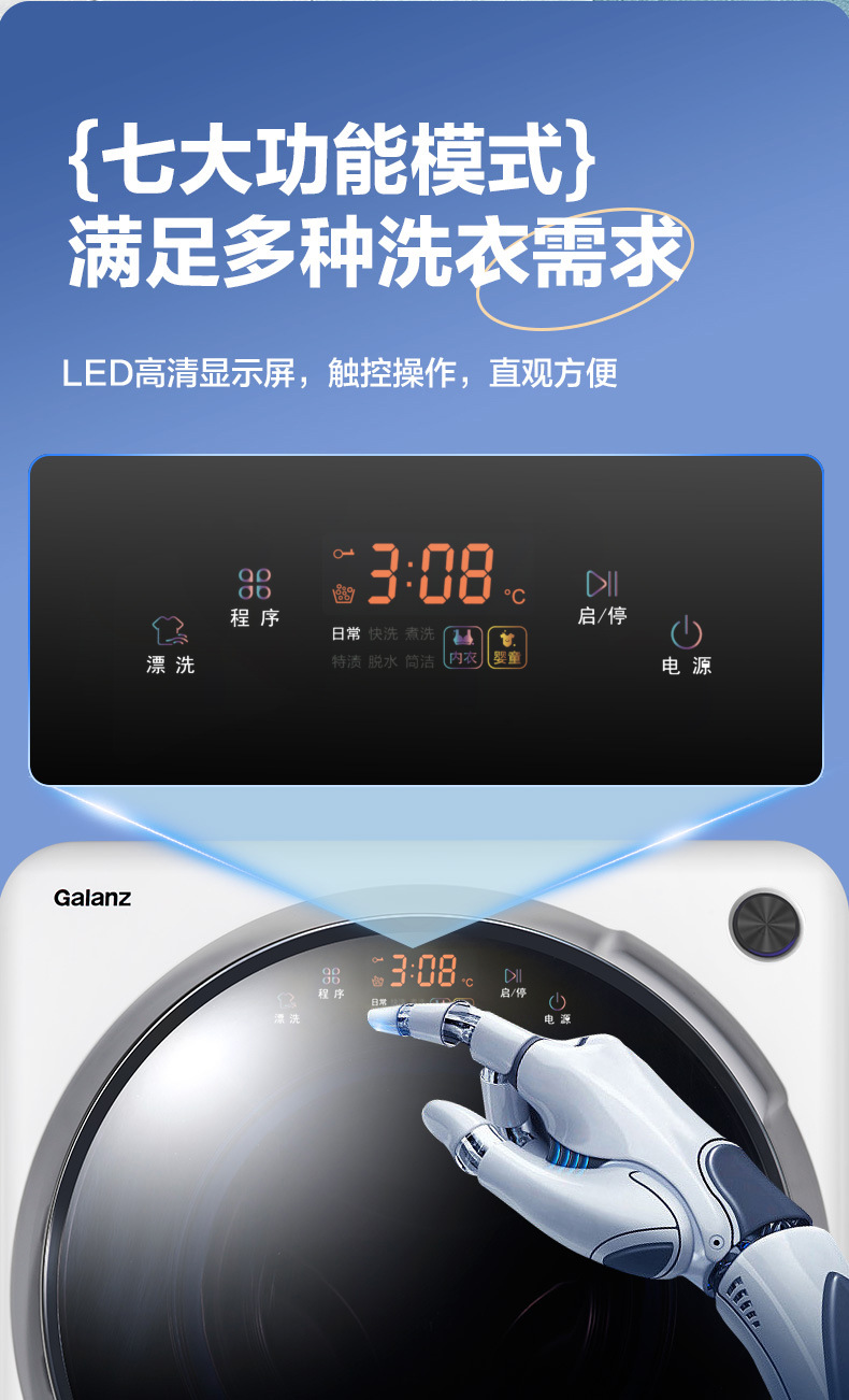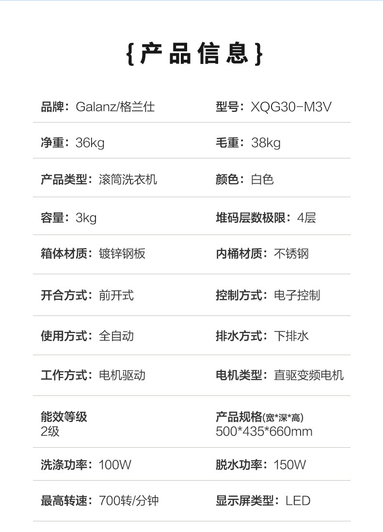品牌: Galanz/格兰仕 产品类型: 滚筒洗衣机 自动化程度: 全自动 洗涤公斤量: 2.1-4.5kg 电机类型: 变频电机 内桶材质: 不锈钢 能效等级: 二级 是否带烘干: 否 型号: 洗衣机XQG30-M3V白色 货源类别: 现货 产地: 广东 箱体材质: 钢板 排水方式: 下排水 开门方式: 前开式 3C证书编号: 2018010705041464 功率: 190W以下 加工方式: 否 加印LOGO: 不可以 脱水容量: 3kg 显示方式: LED数码屏显示 重量: 0.176 kg/件