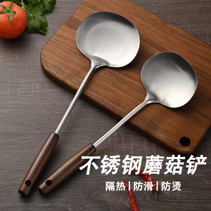不锈钢蘑菇铲老式古木锅铲家用厨具木柄防烫炒菜勺厨房带挂孔煎铲