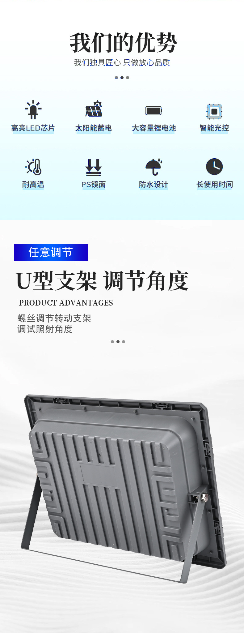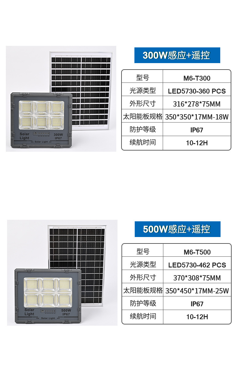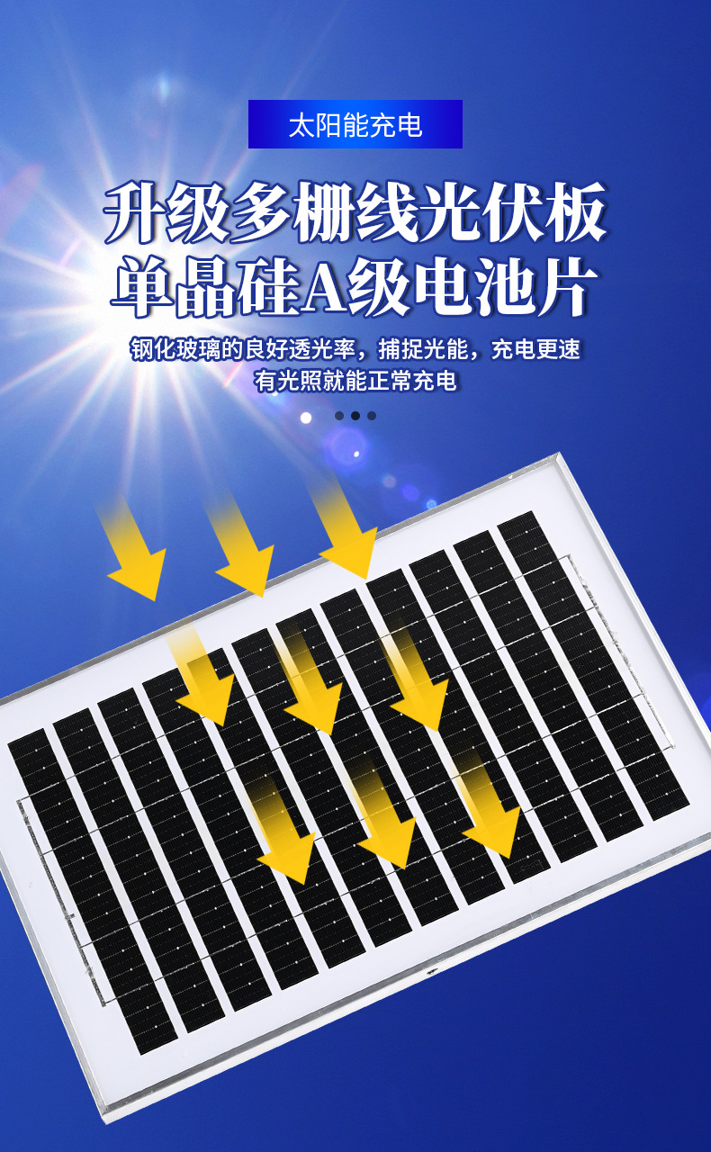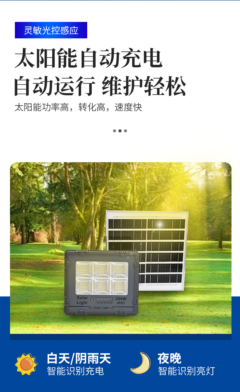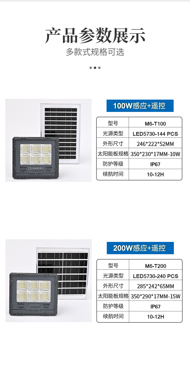 供电方式: 太阳能 输入电压: 3.2V 外壳材质: ABS 塑料+钢化玻璃 功率: "100W 200W 300W 500W 防护等级: IP66 是否进口: 否