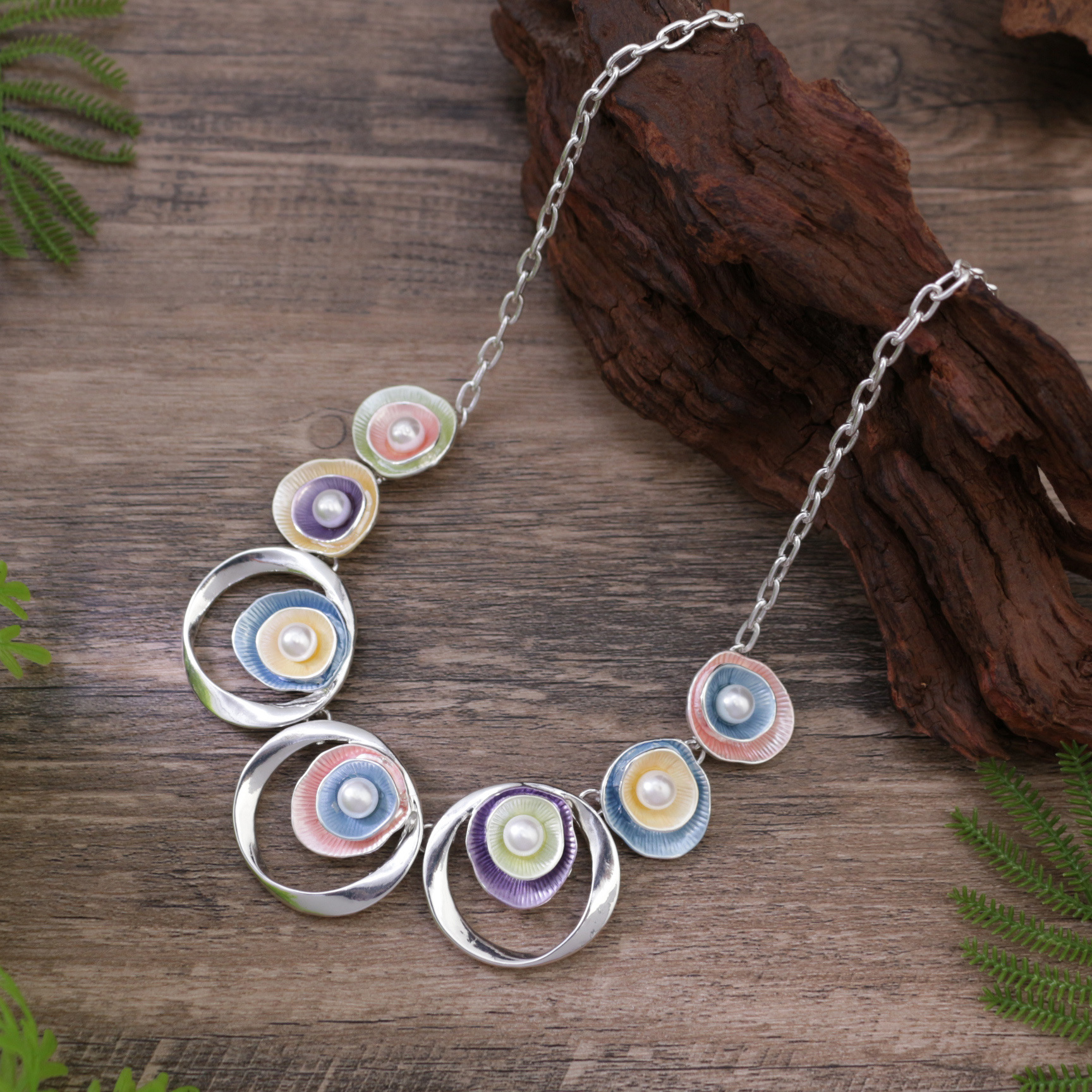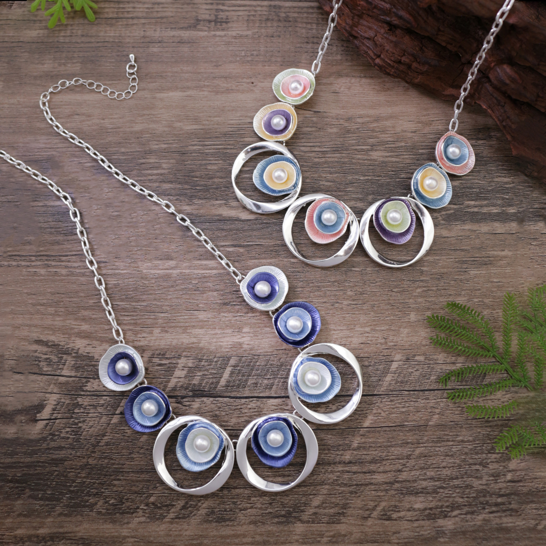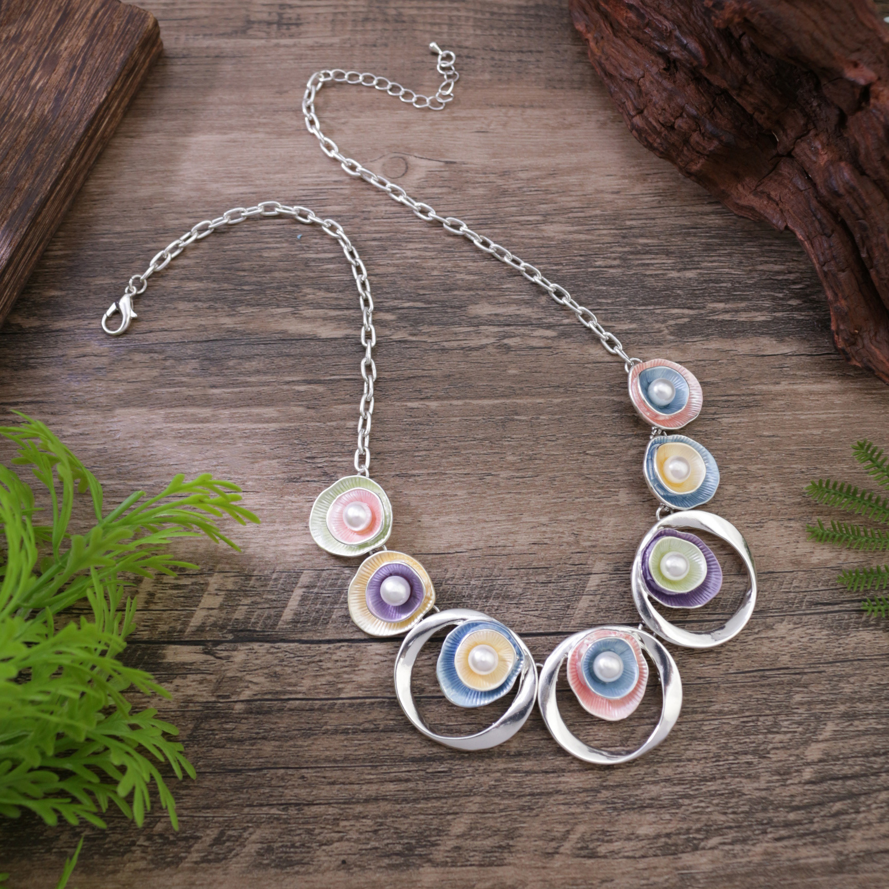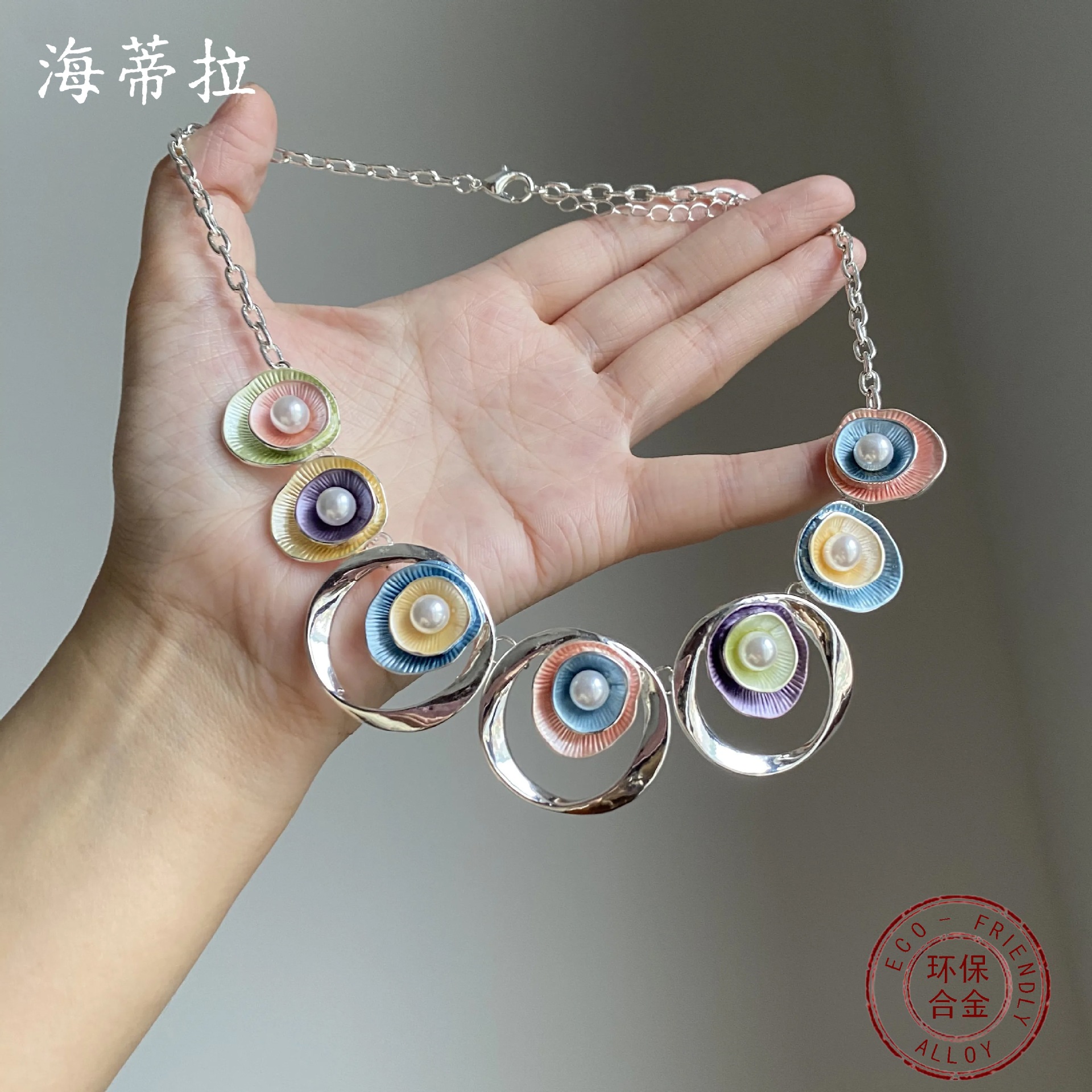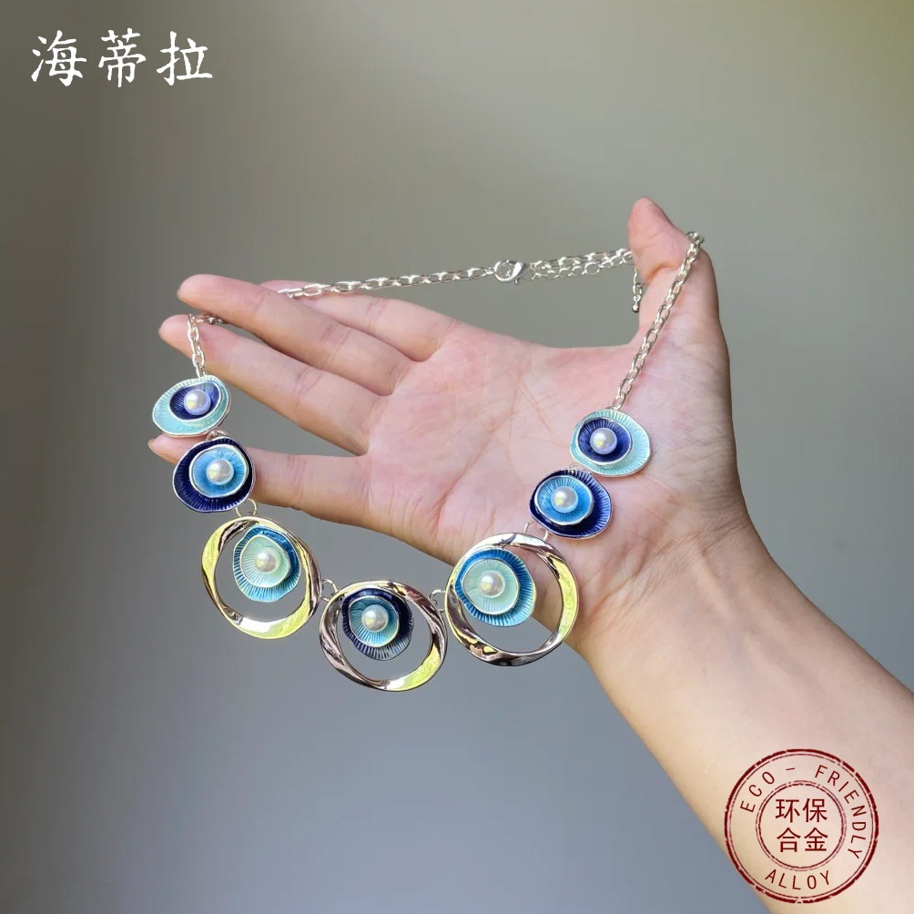 跨境热销彩色画油珍珠镶嵌镂空圆形花朵项链 女士高级感花朵颈链