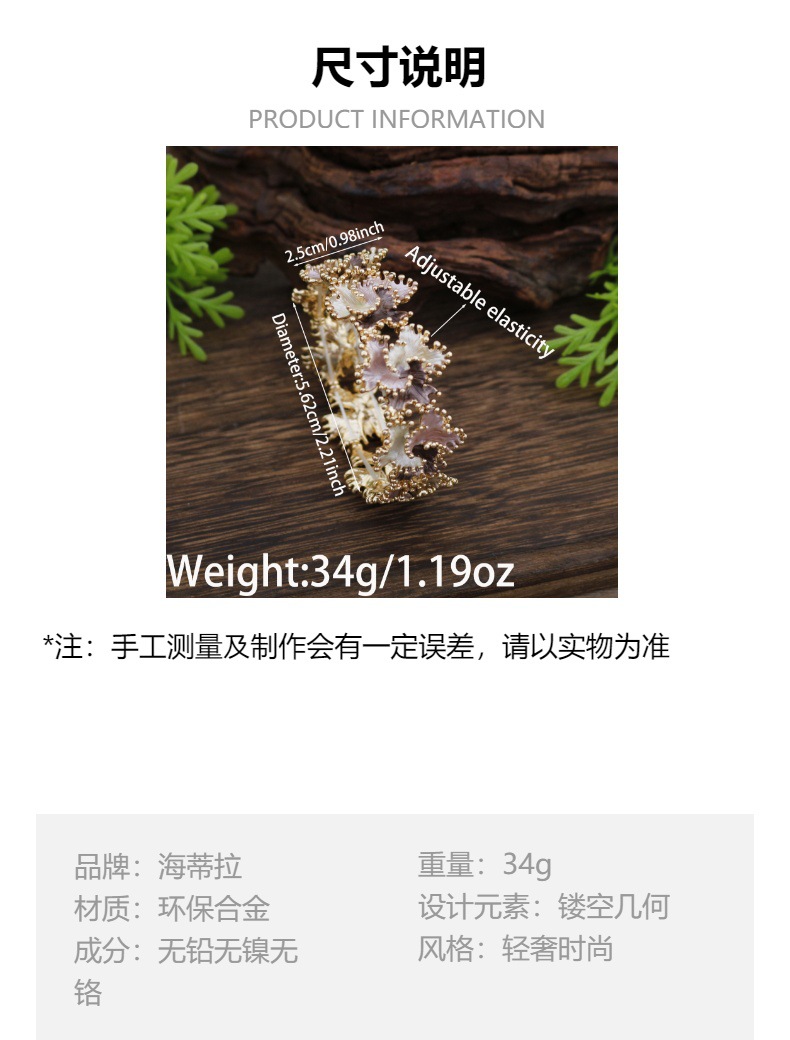 材质: 锌合金 处理工艺: 手工制作 品牌: 海蒂拉 风格: 原创设计 重量: 34g 流行元素: 花朵 货号: B42339 产地: 义乌 有可授权的自有品牌: 是 是否跨境出口专供货源: 是 上市年份/季节: 2025年秋季 风格分类: 原创设计 商品类型: 饰品 流行元素分类: 植物花卉 重量: 0.36 kg/个