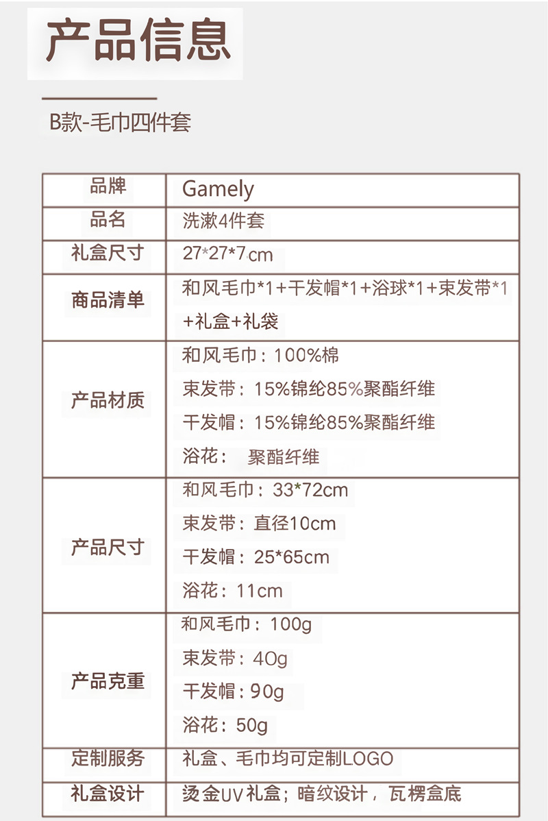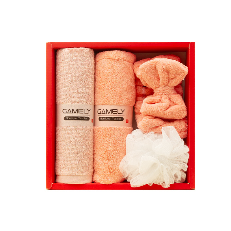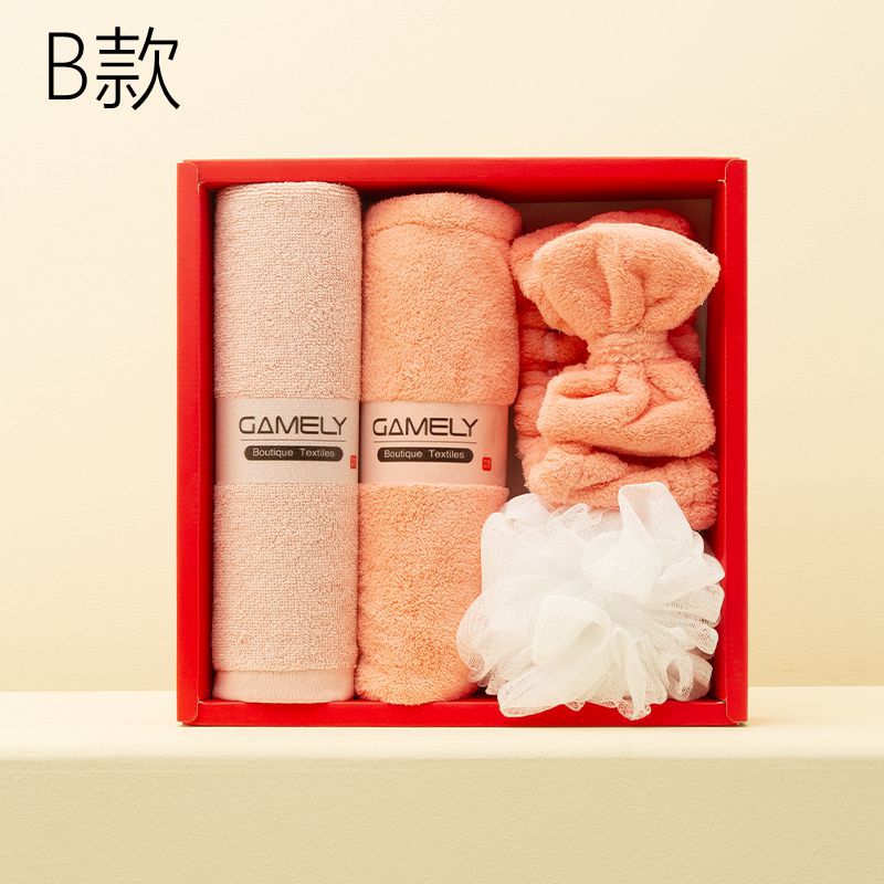 B款:纯棉毛巾100g+干发帽+束发带+50g浴花+红色礼盒