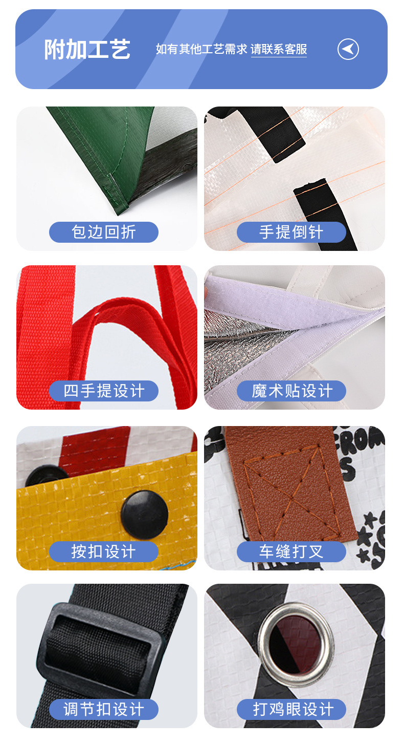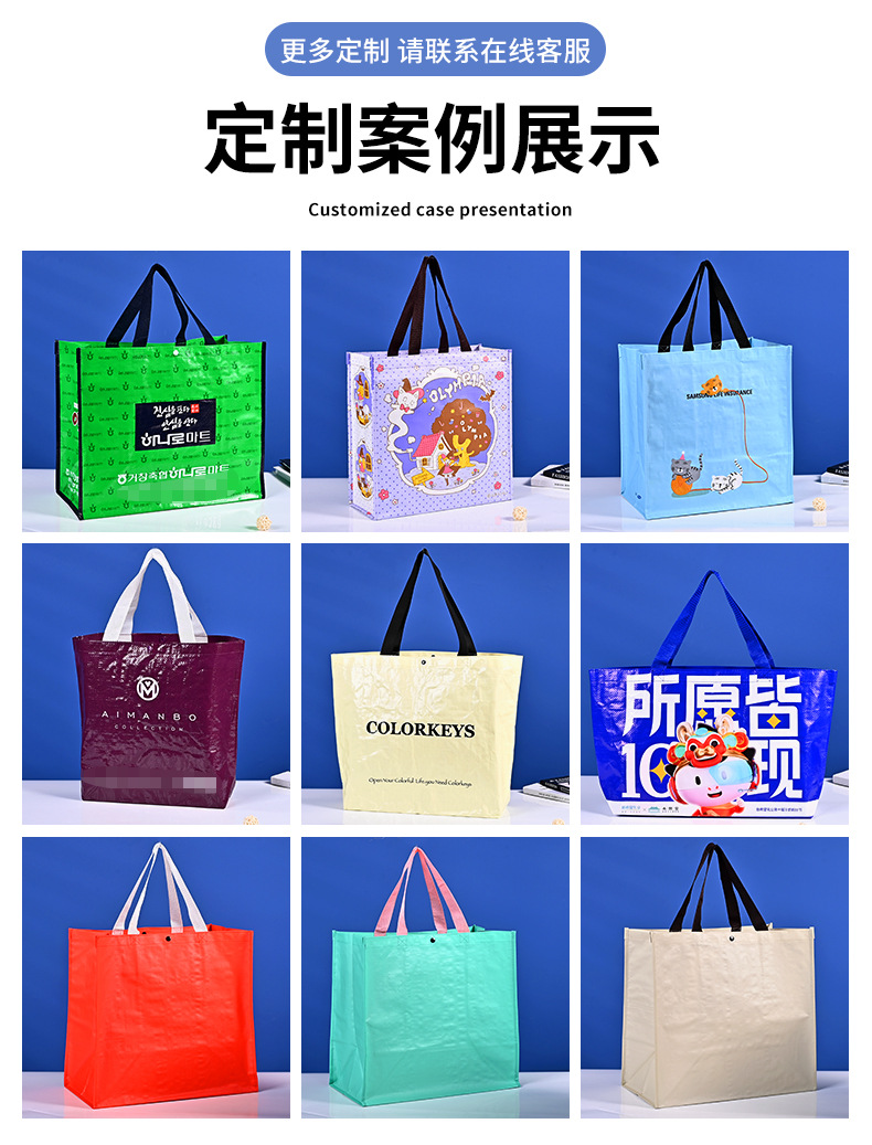 产地: 浙江温州 是否进口: 否 编织料厚度: 90 货号: 0054 材质: 编织料覆膜 承重: 25 规格尺寸: 不管拍多少都随机发一个样品 加工定制: 是 可否用于出口: 可以 类型: 手提编织袋 印刷: 彩印 用途: 通用包装 品牌: 麦兜 有可授权的自有品牌: 否 是否跨境出口专供货源: 是 是否自封口: 否 颜色: 定制详情咨询客服