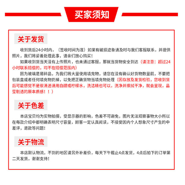 1玻璃制品,属于易碎品,正常运输中,3%的破损属于正常范围,介意者请慎拍。