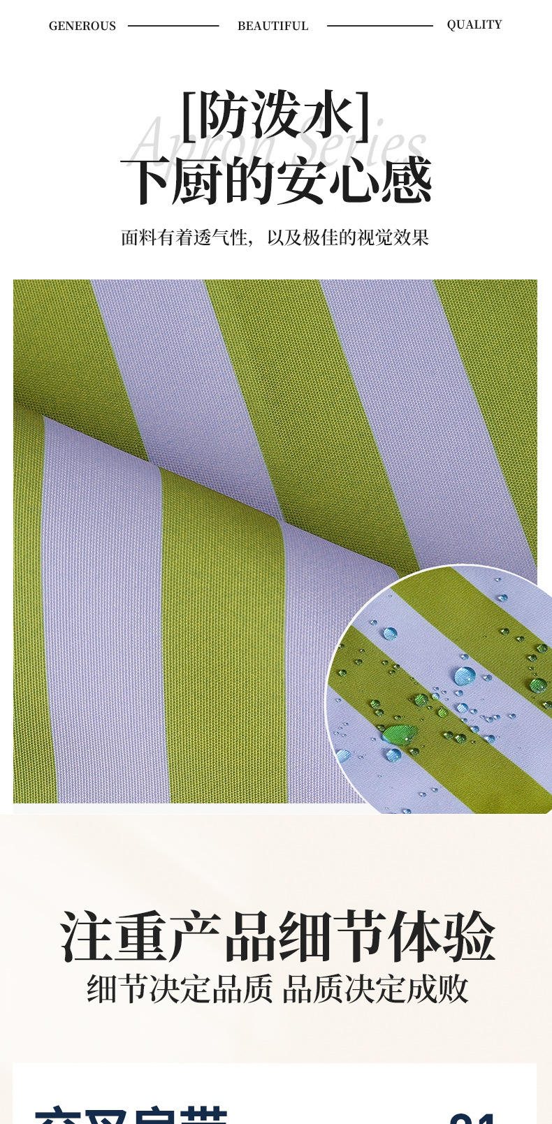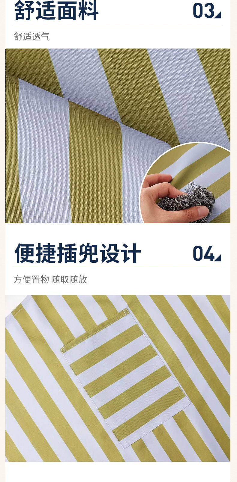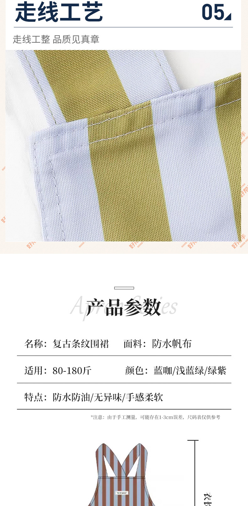 材质: 防水帆布 产品类别: 围裙 用途: 防污 品牌: 家雅居 人群: 男士,女性,成人 图案: 纯色 围裙分类: 无袖围裙 是否进口: 否 尺码: 均码 风格: 现代简约 花色: 纯色 专利: 否 货号: JZH0032 颜色: 浅蓝绿条纹,绿紫条纹,蓝咖条纹 规格: 80X100 有可授权的自有品牌: 是 是否跨境出口专供货源: 是 适用季节: 四季通用 是否一次性: 否