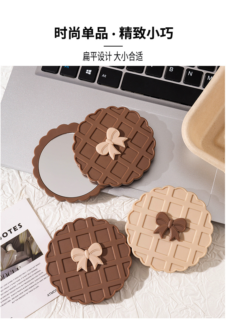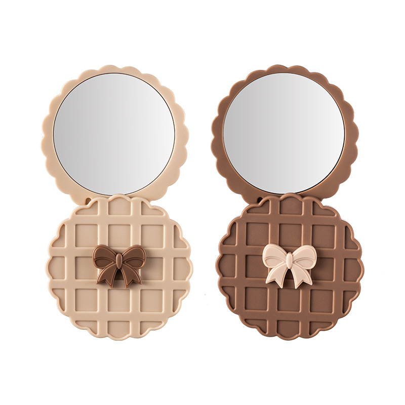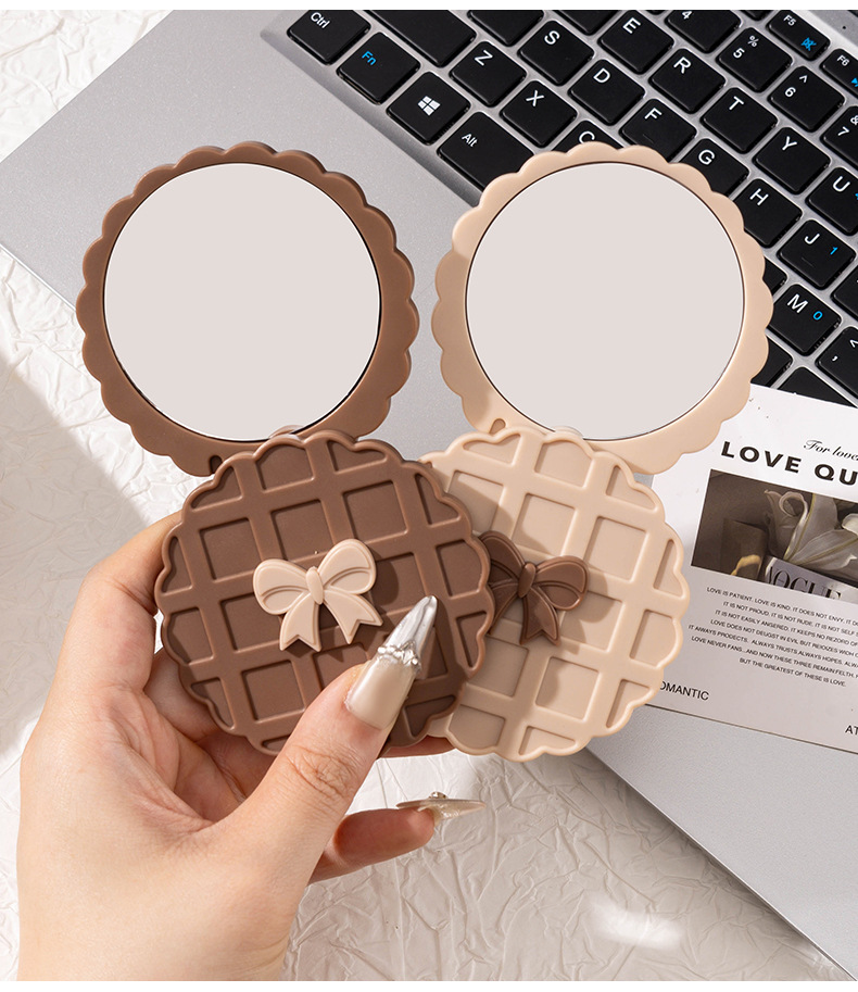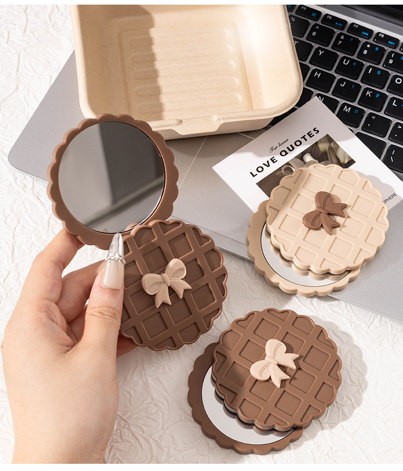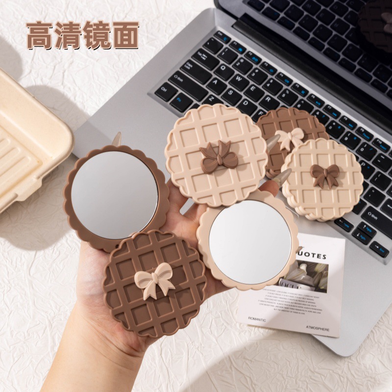 咖色米白色华夫饼造型化妆镜随身带便携小镜子高清镜面旋转开合镜