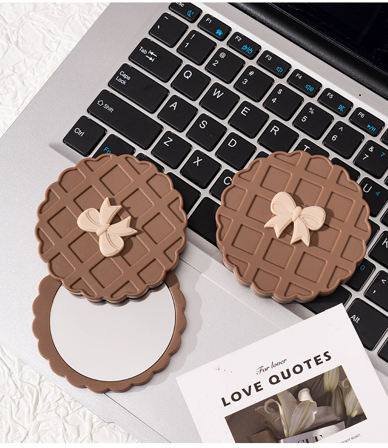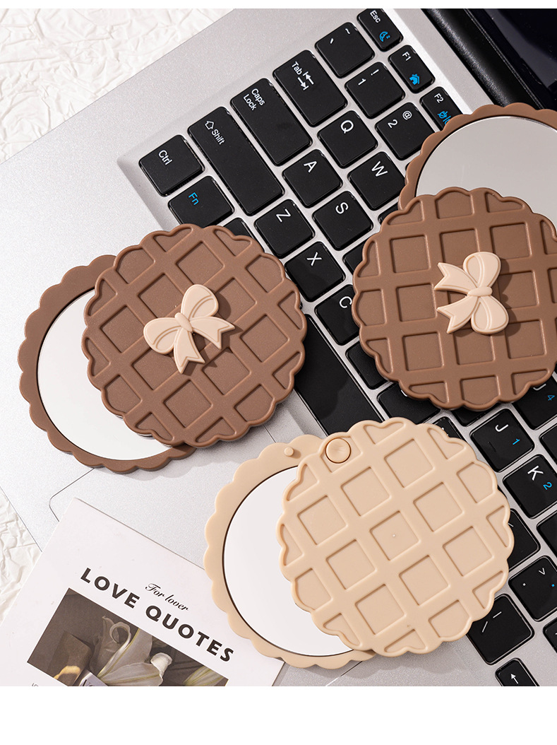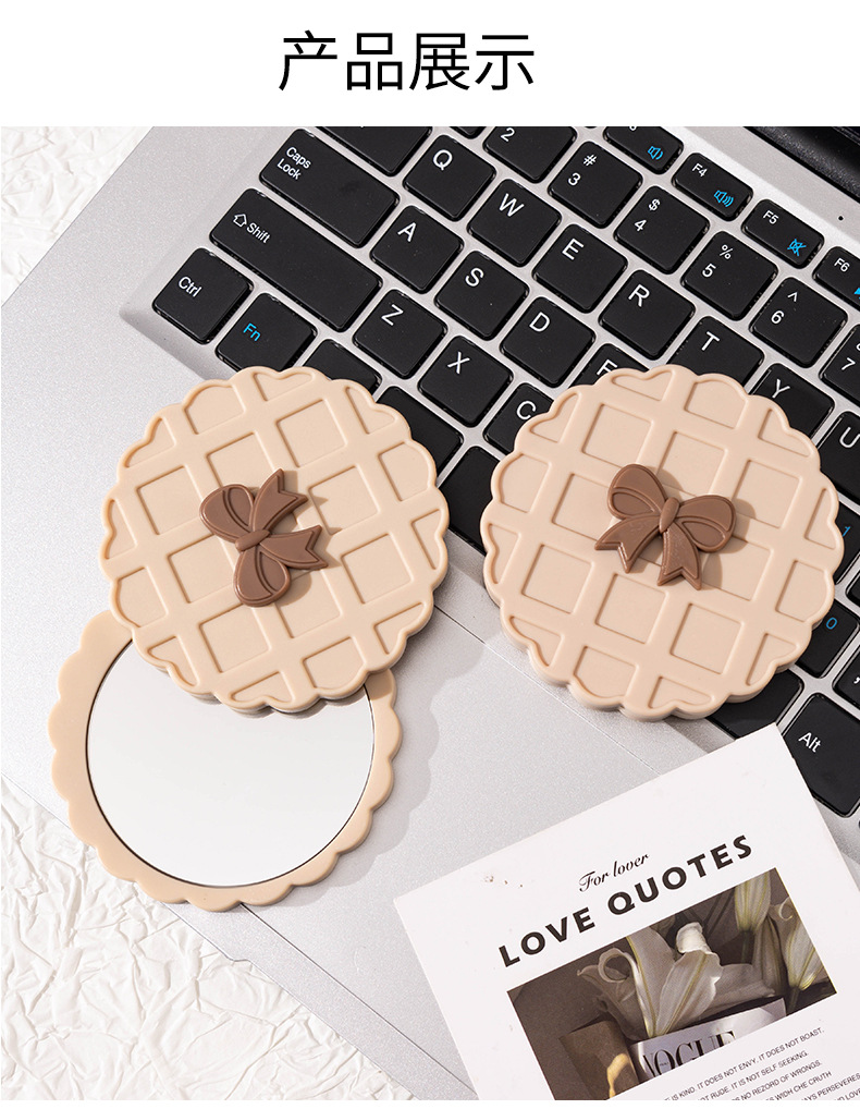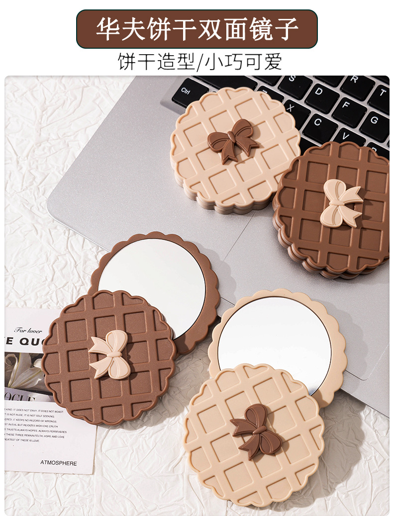 咖色米白色华夫饼造型化妆镜随身带便携小镜子高清镜面旋转开合镜