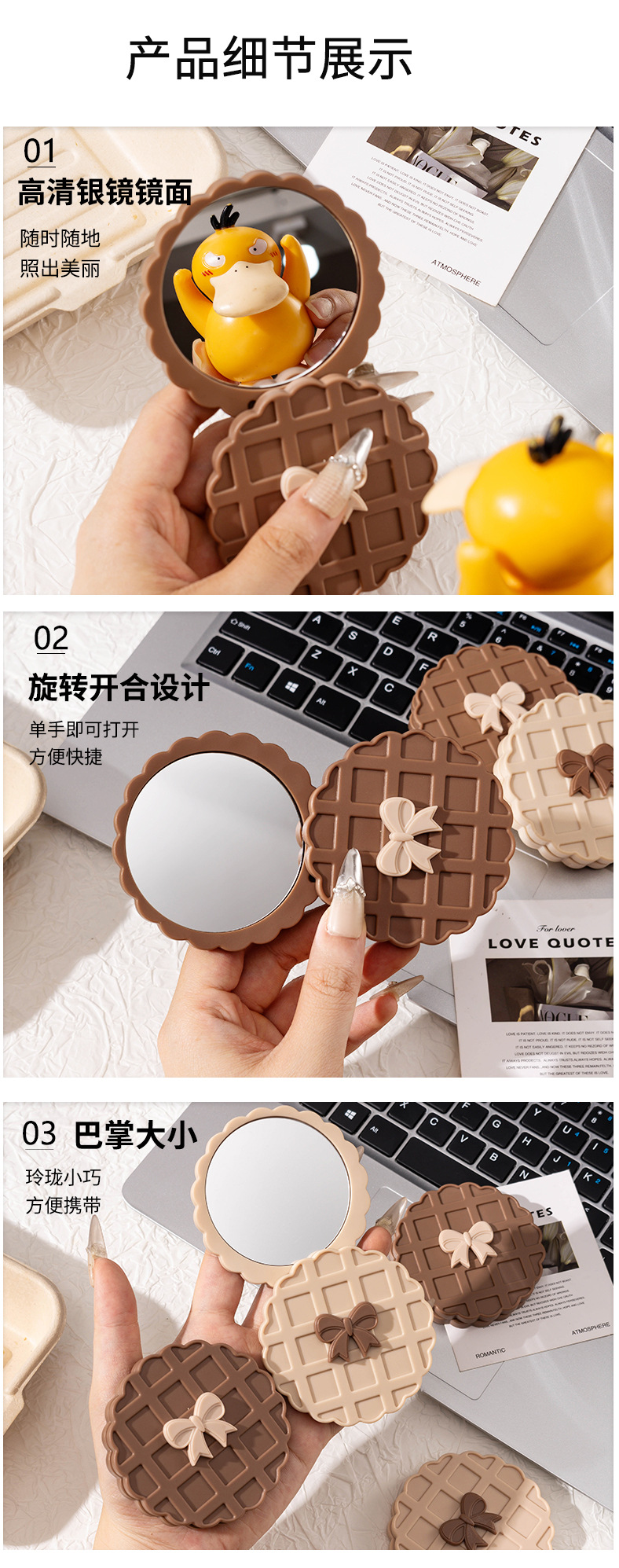 咖色米白色华夫饼造型化妆镜随身带便携小镜子高清镜面旋转开合镜 投诉