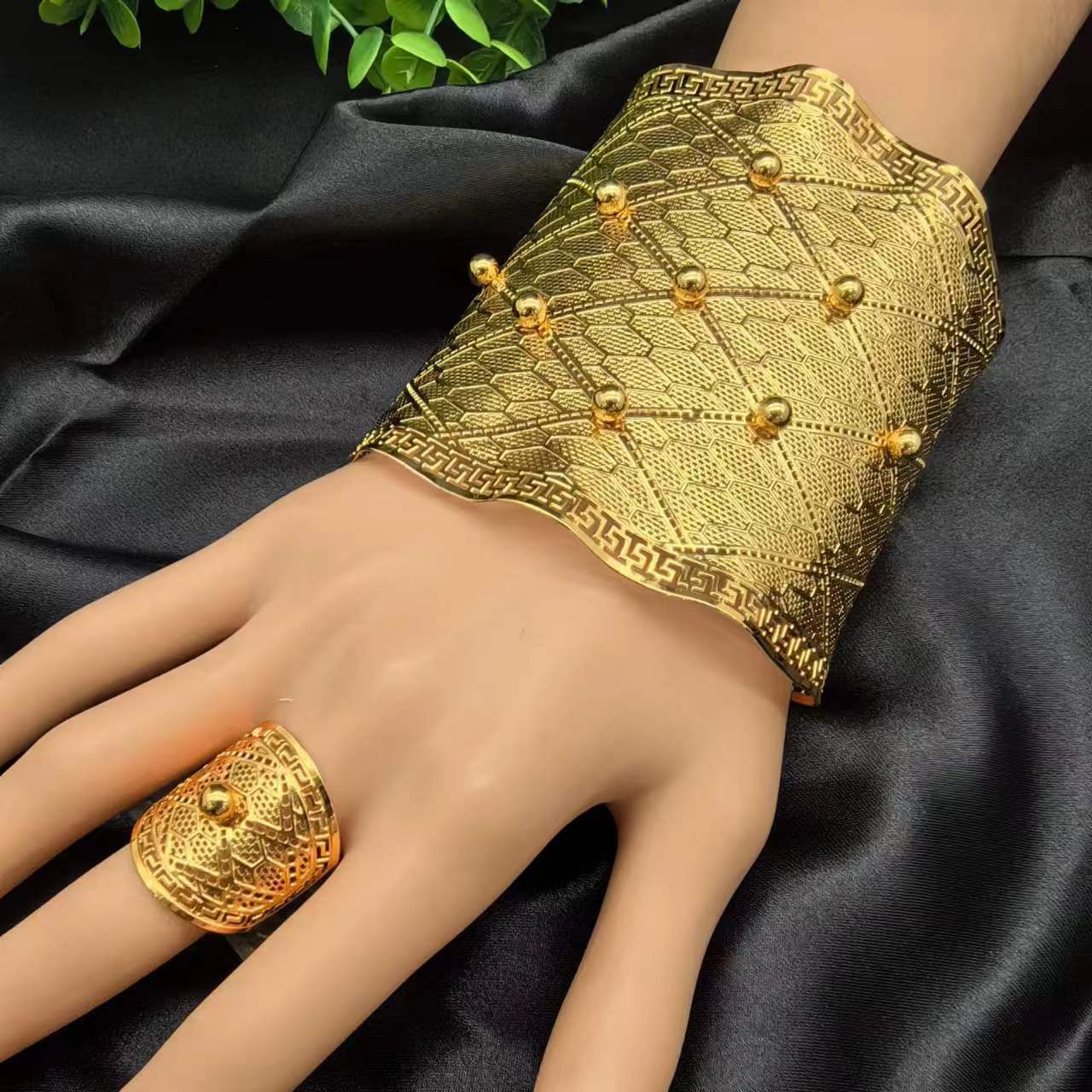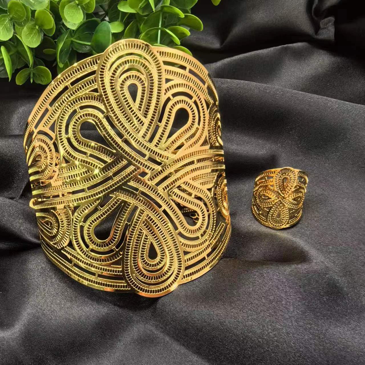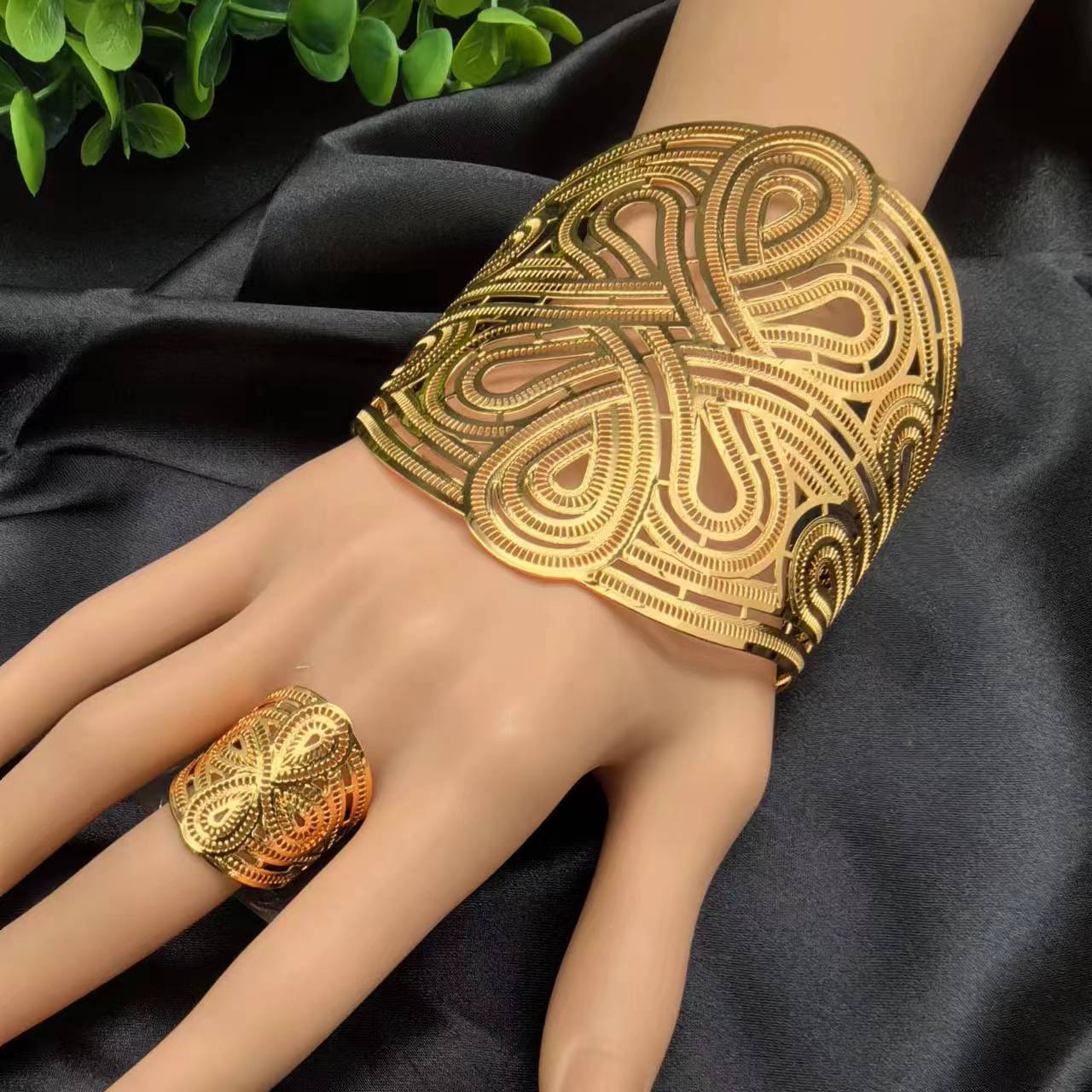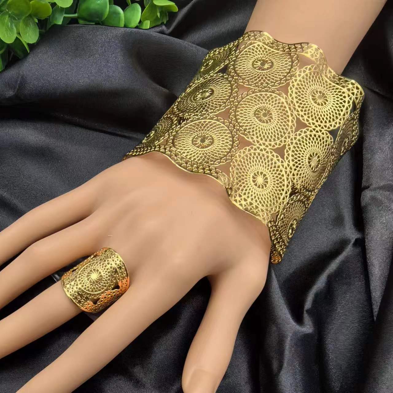 2024新款开口花朵大手镯戒指套装欧美迪拜非洲新娘沙金手镯不掉色 投诉