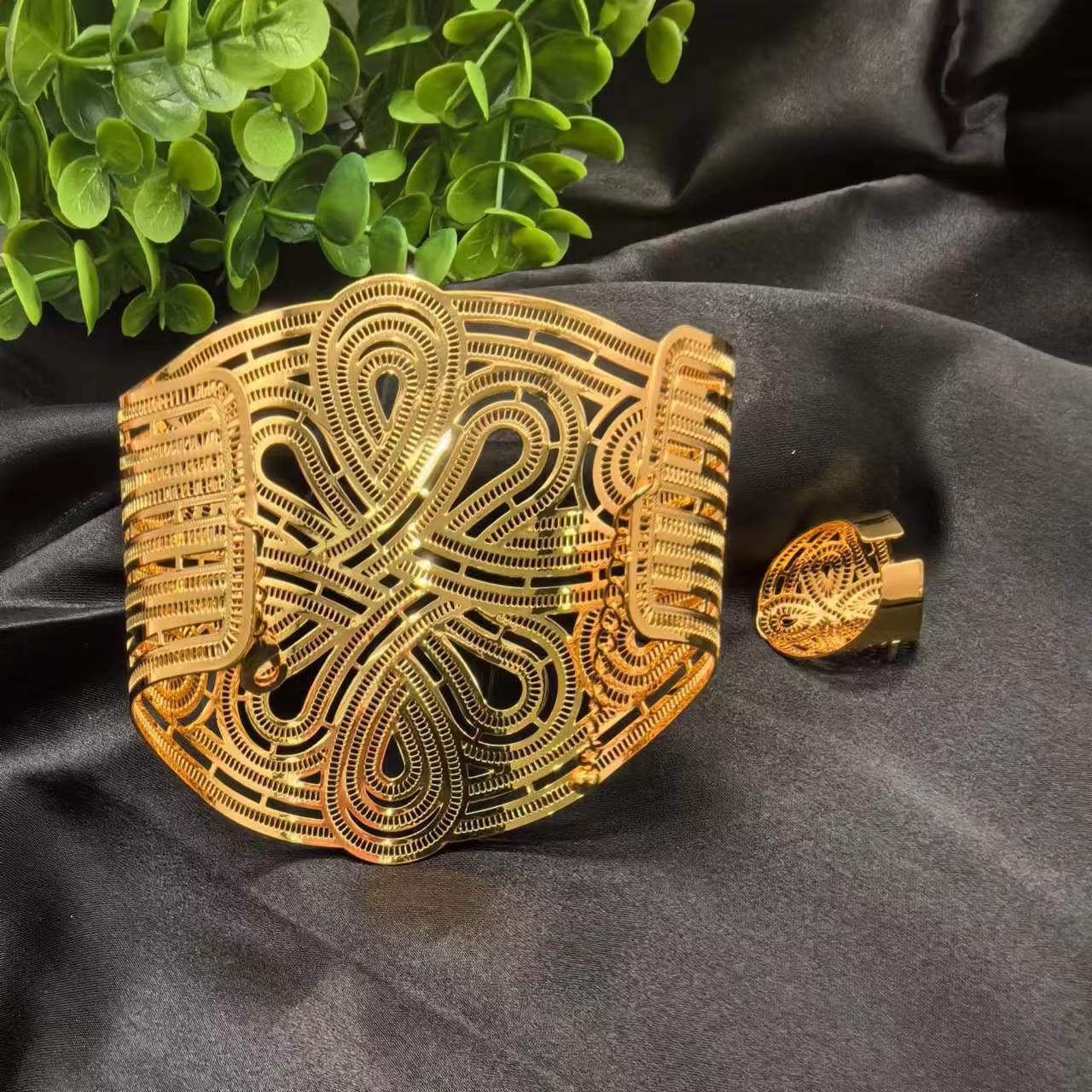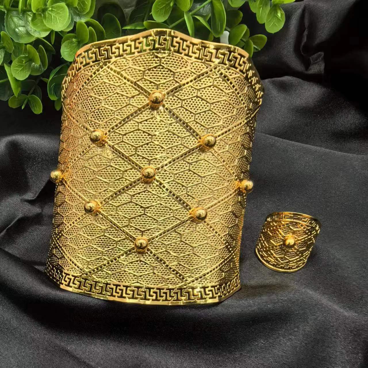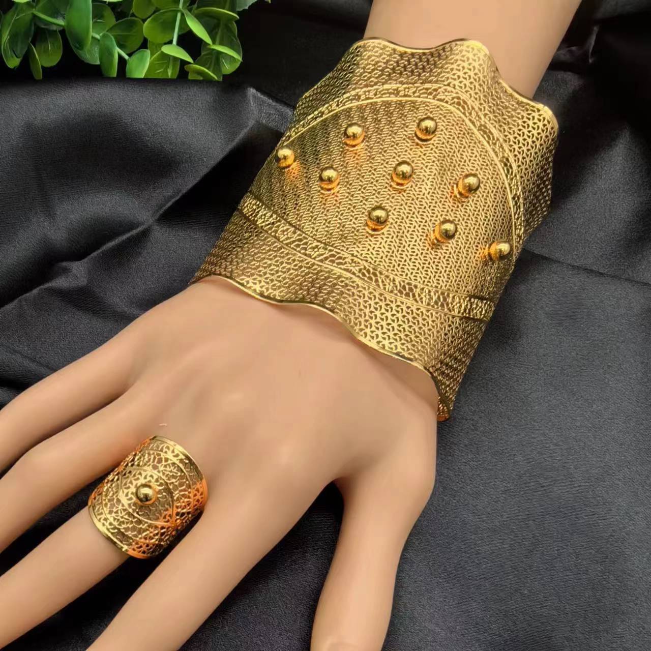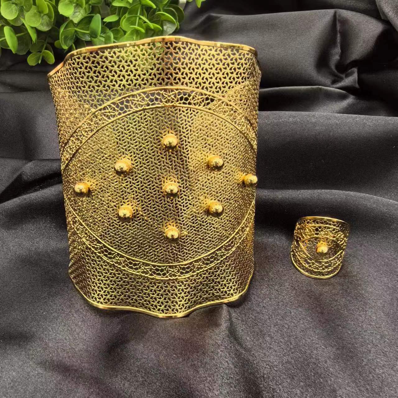 2024新款开口花朵大手镯戒指套装欧美迪拜非洲新娘沙金手镯不掉色 投诉