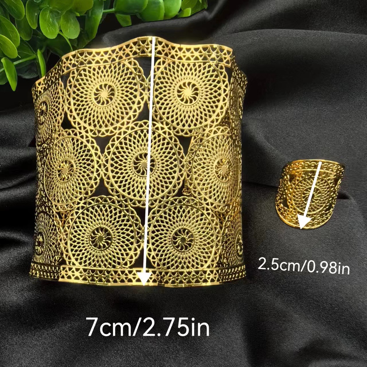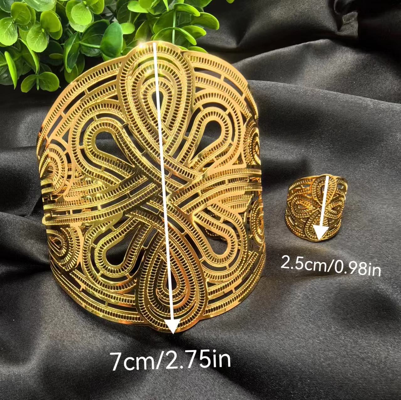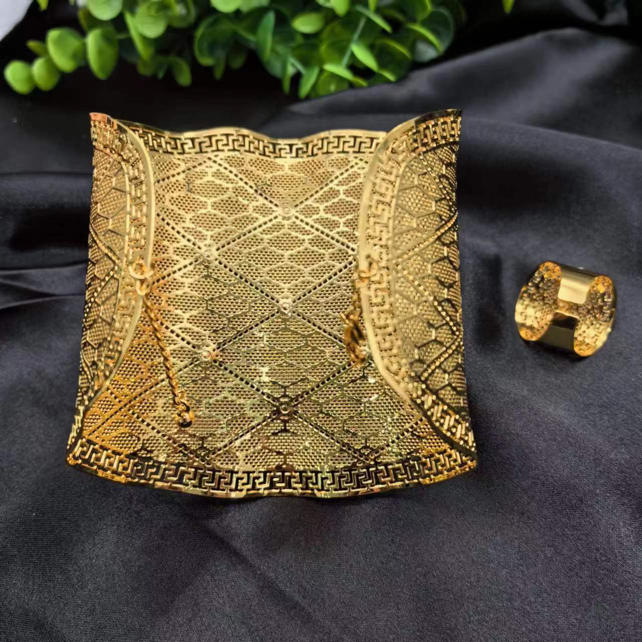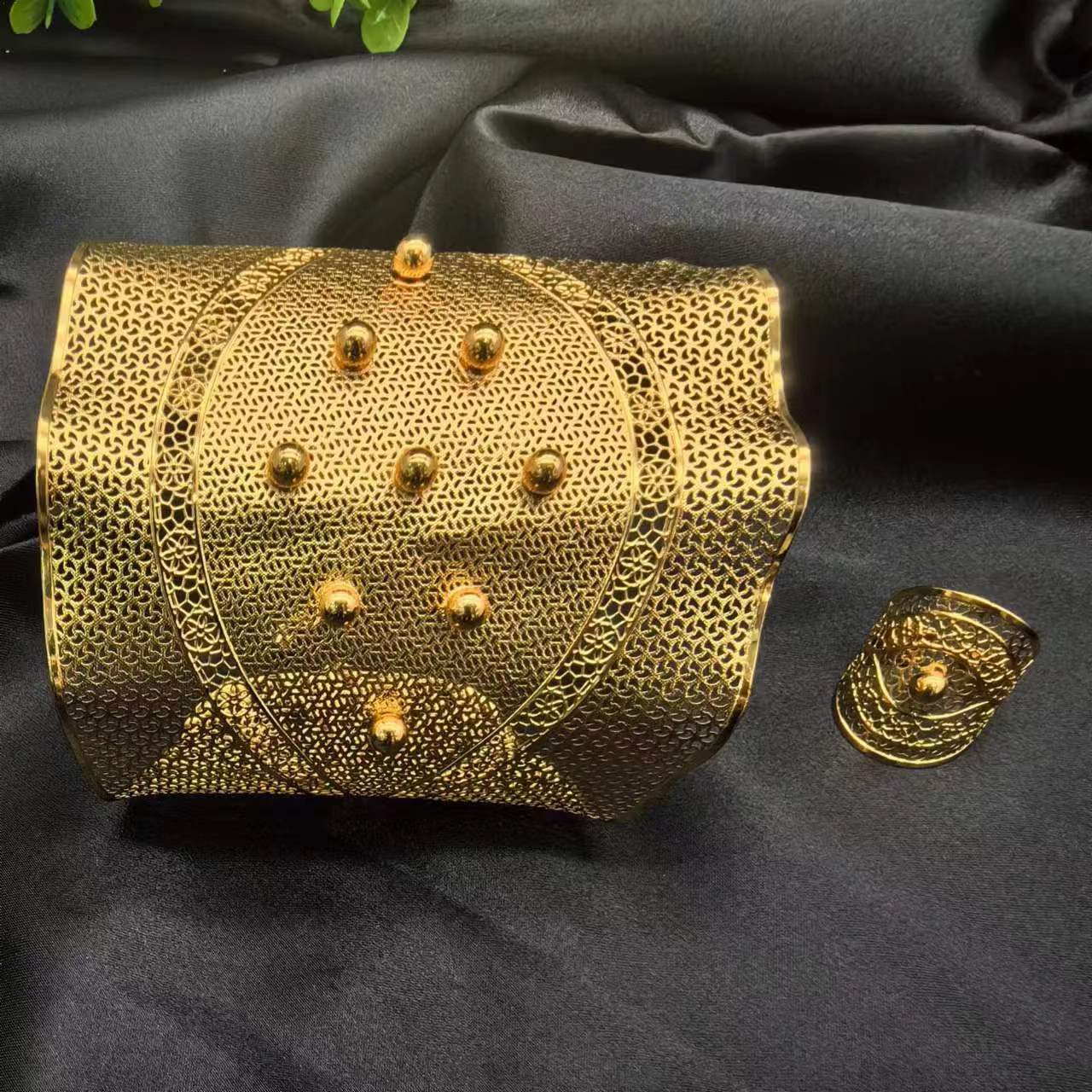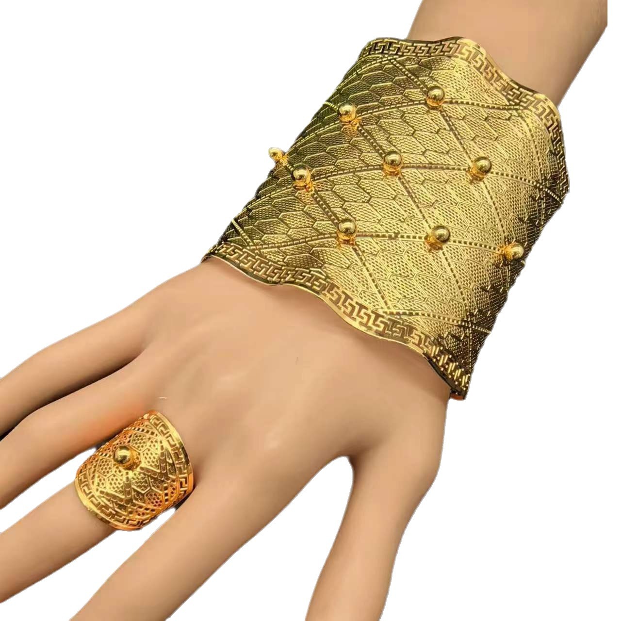 2024新款开口花朵大手镯戒指套装欧美迪拜非洲新娘沙金手镯不掉色 投诉
