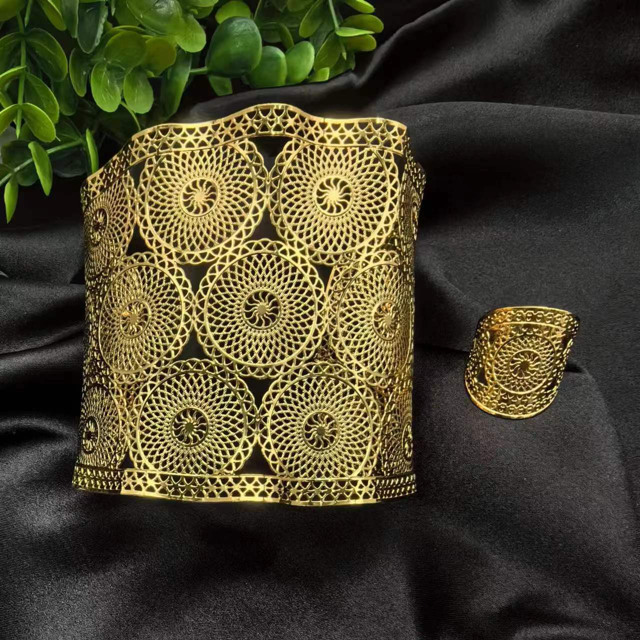 2024新款开口花朵大手镯戒指套装欧美迪拜非洲新娘沙金手镯不掉色