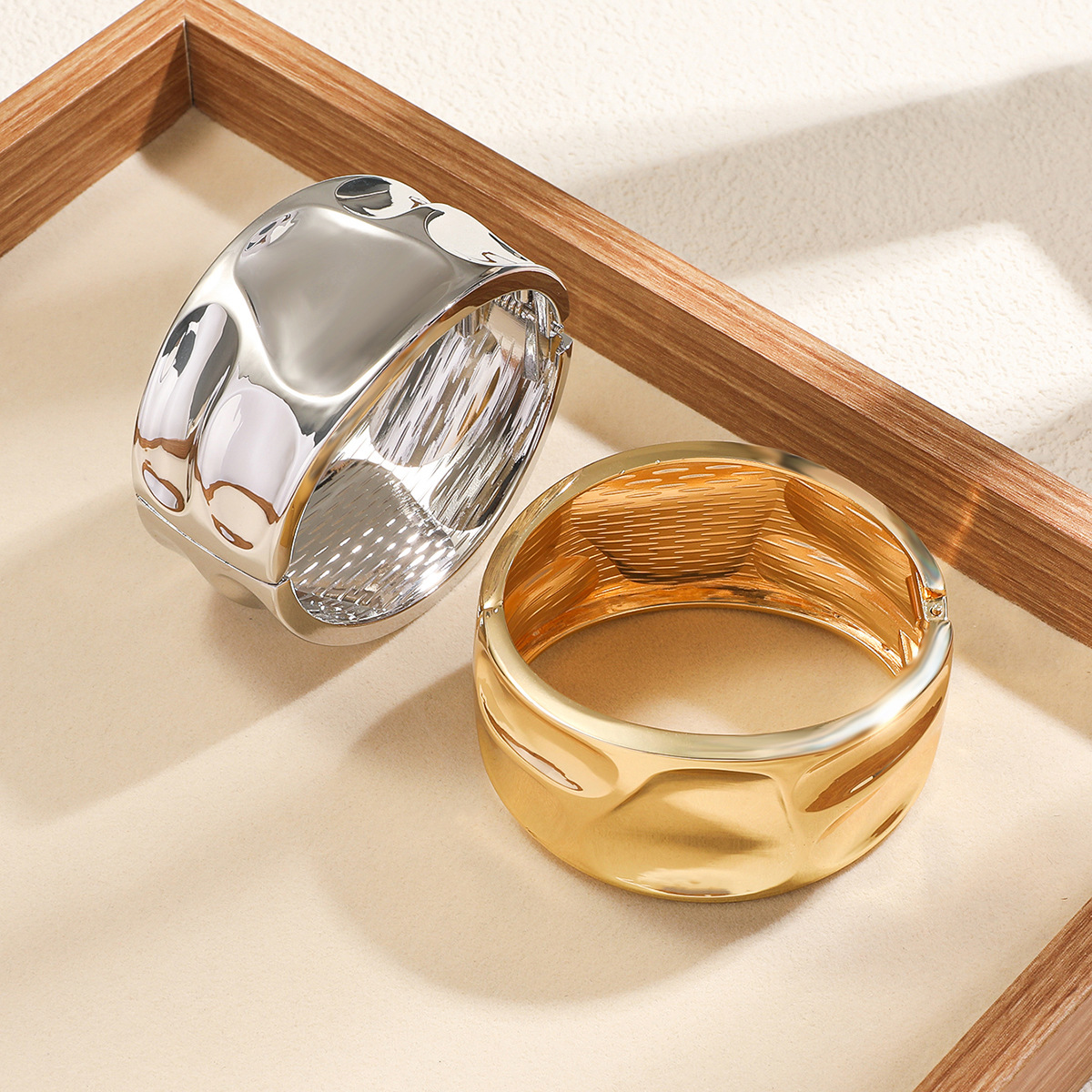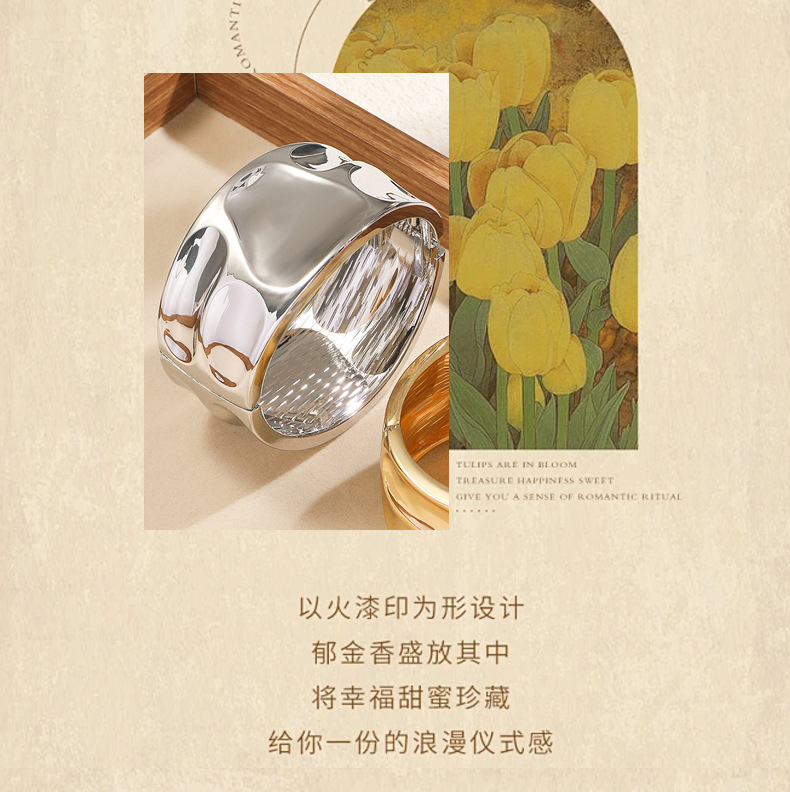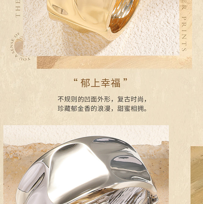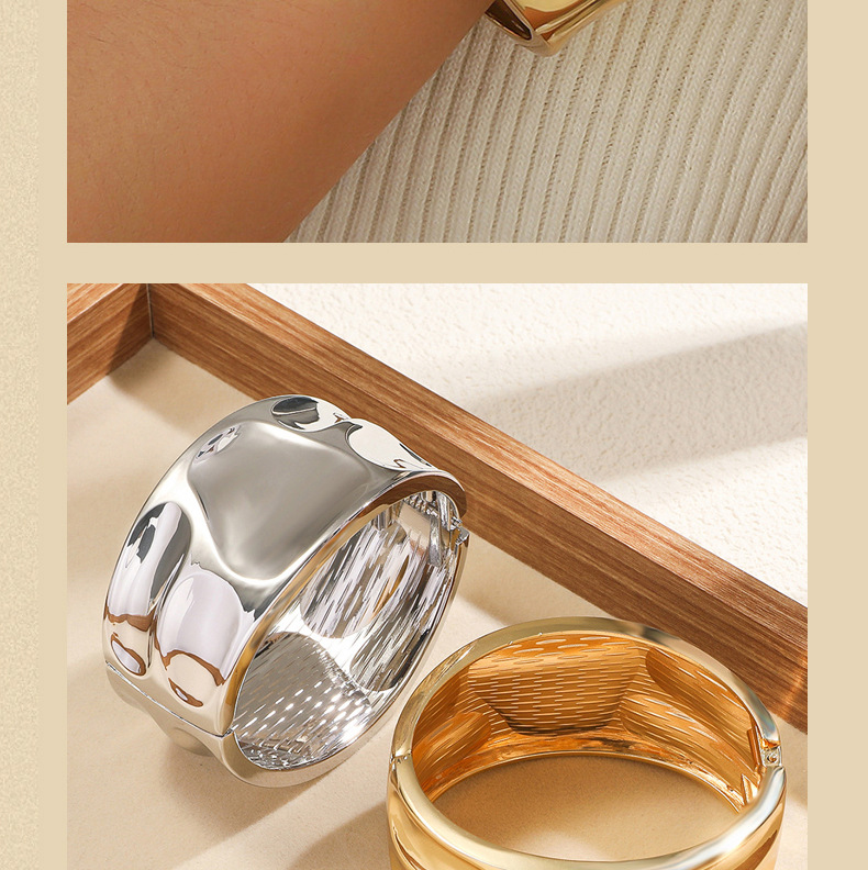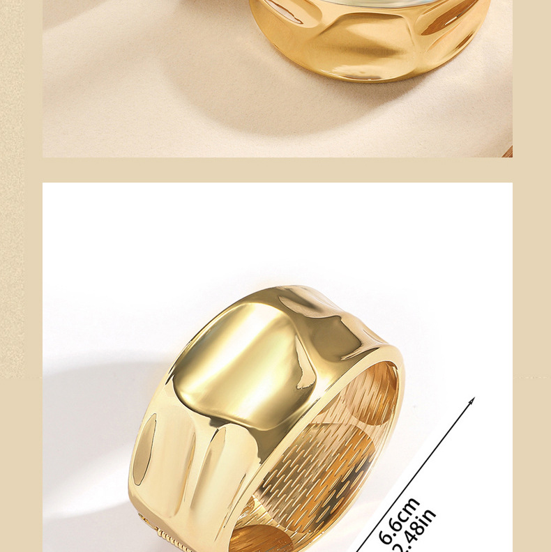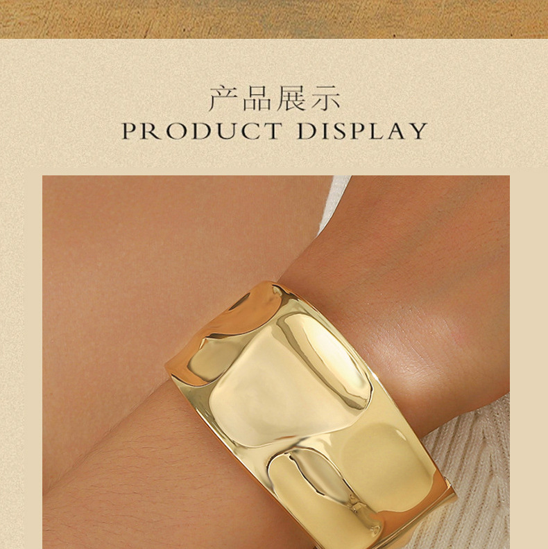材质: 金属 处理工艺: 电镀 品牌: 其他 风格: 时尚OL 重量: 60g 流行元素: 褶皱 货号: 新款流行褶皱宽边手镯 产地: 义乌 颜色: 金色,银色 有可授权的自有品牌: 否 是否跨境出口专供货源: 是 上市年份/季节: 2025年秋季 风格分类: 时尚通勤 流行元素分类: 形状/图案 重量: 0.477 kg/个