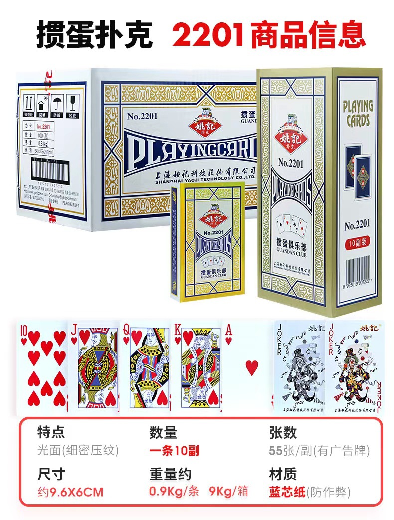 材质: 中华纸 产品类别: 扑克 品牌: 姚记 包装: 纸盒 加印LOGO: 可以 规格: 其他 货号: 2201 产地: 上海 适用送礼场合: 旅游纪念,广告促销,商务馈赠 加工定制: 否 适用场景: 棋牌娱乐 是否跨境出口专供货源: 否 专利类型: 无 重量: 0.275 kg/副
