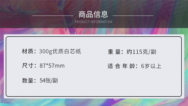 材质: 白芯纸 产品类别: 扑克 品牌: King Magic 包装: 500副一箱 加印LOGO: 可以 规格: 57*87 货号: 流影裟罗 产地: 浙江 加工定制: 否 适用场景: 棋牌娱乐 颜色: 流影,裟罗,酡颜,秋浦 有可授权的自有品牌: 否 是否跨境出口专供货源: 是 专利类型: 无 外贸出口认证: 无 质检报告编号: 无 重量: 0.202 kg/副