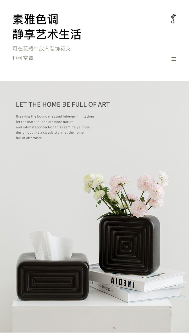 材质: 陶瓷 工艺: 色釉 表面工艺: 上釉 风格: 简约现代 包装: 普通包装 货号: 纸巾盒 加工定制: 是 是否专利货源: 否 是否进口: 否 是否跨境出口专供货源: 是 主要销售地区: 欧洲,北美 主要下游平台: 亚马逊,速卖通,其他 有可授权的自有品牌: 否 颜色: 回字纸巾盒白色,回字纸巾盒黑色,回字花瓶 是否属于礼品: 否 是否IP授权: 否 家居摆件: 创意纸巾盒 跨境热卖: 纸巾盒 陶瓷工艺品: 陶瓷纸巾盒 重量: 1.0 kg/件
