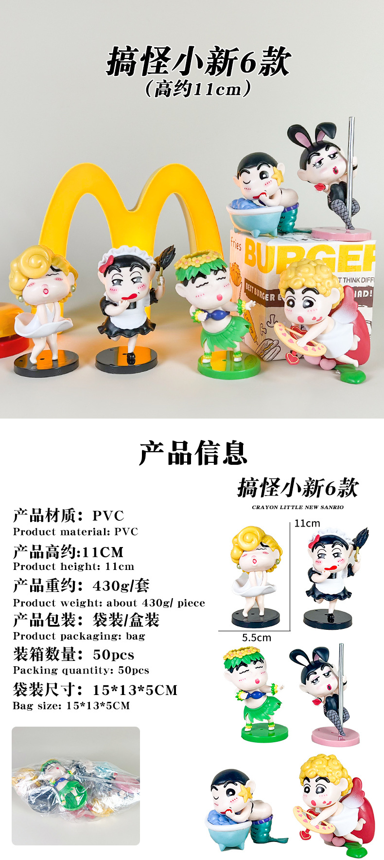 材质: PVC 品牌: 童年动漫 动漫角色: 蜡笔小新 包装方式: 网袋 规格: 袋装,产品高度约11CM 适用年龄: 青少年(15-17岁) 产地: 大陆 是否有动漫形象: 是 货号: LBXX091 是否有导购视频: 是 是否拼装: 是 是否专供外贸: 否 3C配置类别: 14岁以上的玩具 颜色: 二代搞怪小新6款【袋装】,盲盒请联系客服 主要下游平台: ebay,亚马逊,wish,速卖通,独立 主要销售地区: 非洲,欧洲,南美,东南亚,北美,东北亚, 是否跨境出口专供货源: 是 重量: 0.001 kg/套