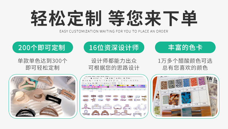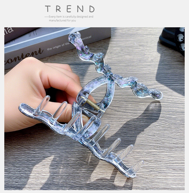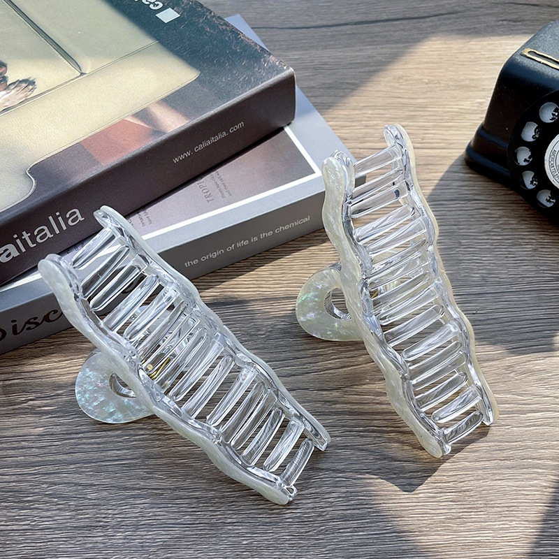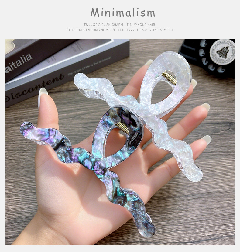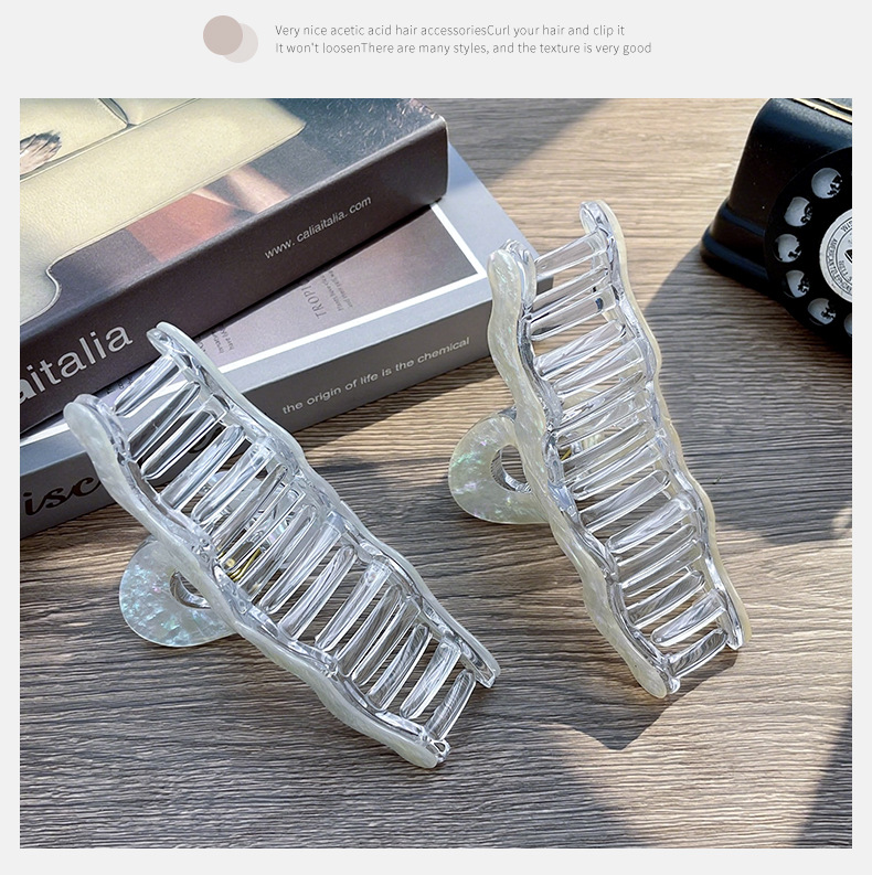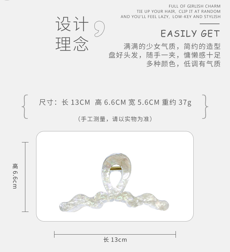 材质: 亚克力 品牌: 夏微宜 发夹分类: 抓夹 流行元素: 自然 风格: 休闲风 处理工艺: 纯手工制作 镶嵌材质: 非镶嵌 货号: 454 样式: 女式 产地: 金华 有可授权的自有品牌: 是 是否跨境出口专供货源: 是 上市年份/季节: 2025夏季 风格分类: 时尚通勤 适用人群: 女式 流行元素分类: 自然 重量: 0.05 kg/个