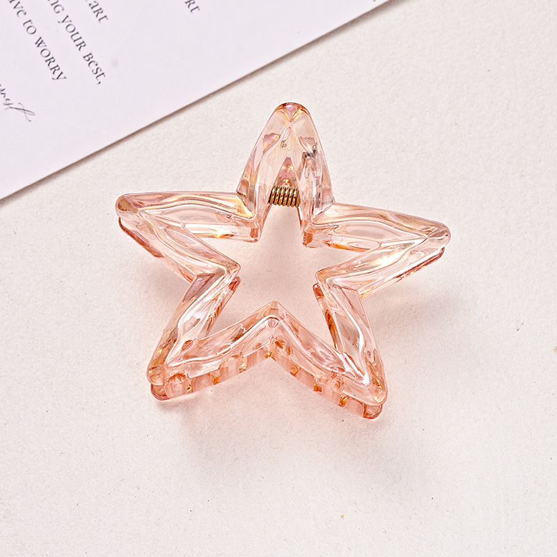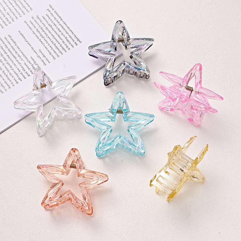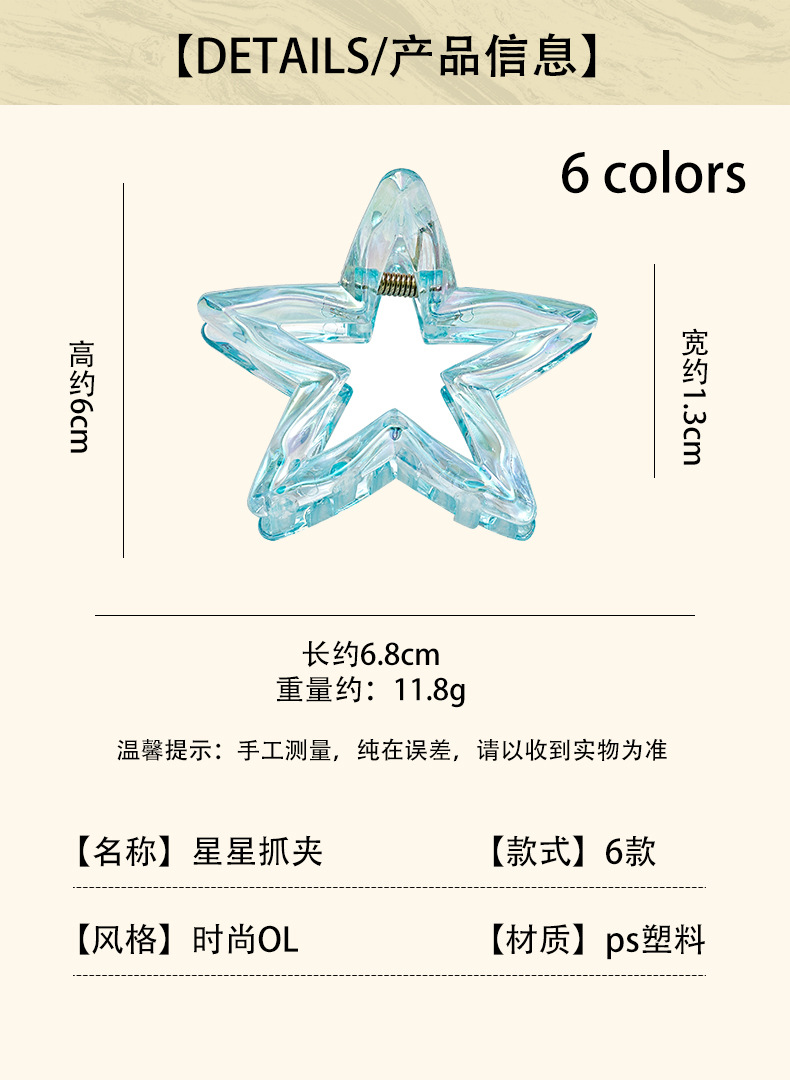 材质: 塑料 发夹分类: 抓夹 流行元素: 五角星 风格: 度假风 处理工艺: 电镀 镶嵌材质: 非镶嵌 样式: 女式 产地: 义乌 颜色: 灰色,白色,黄色,蓝色,粉色,橙色 是否跨境出口专供货源: 是 上市年份/季节: 2025年春季 风格分类: 清新甜美 适用人群: 女式 流行元素分类: 形状/图案 重量: 0.05 kg/个