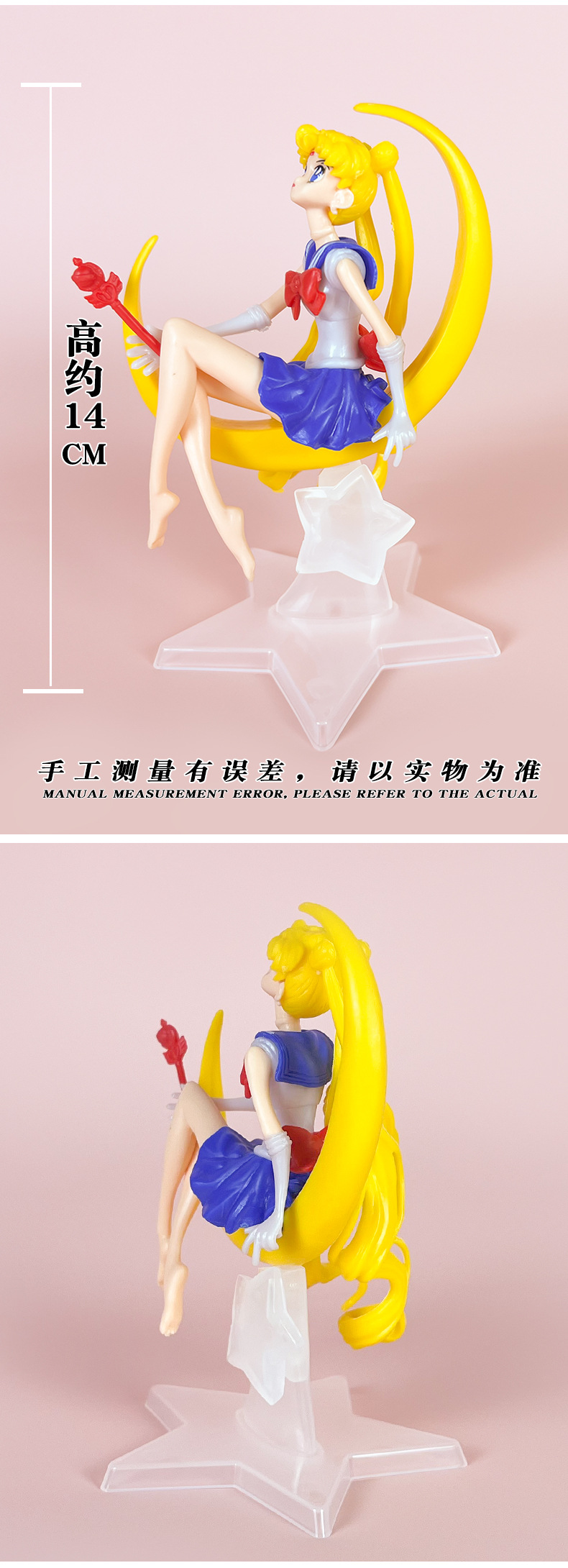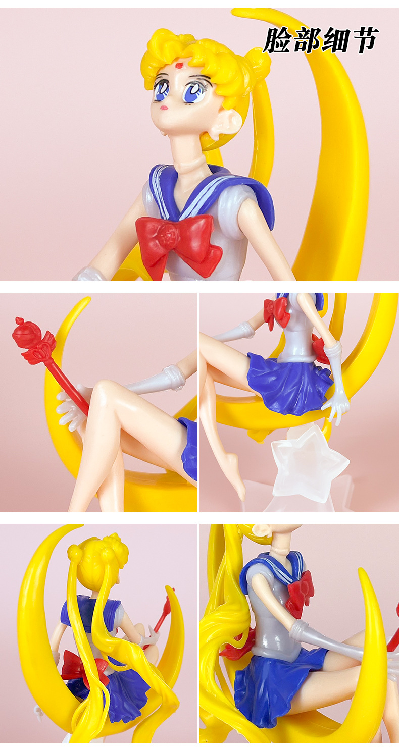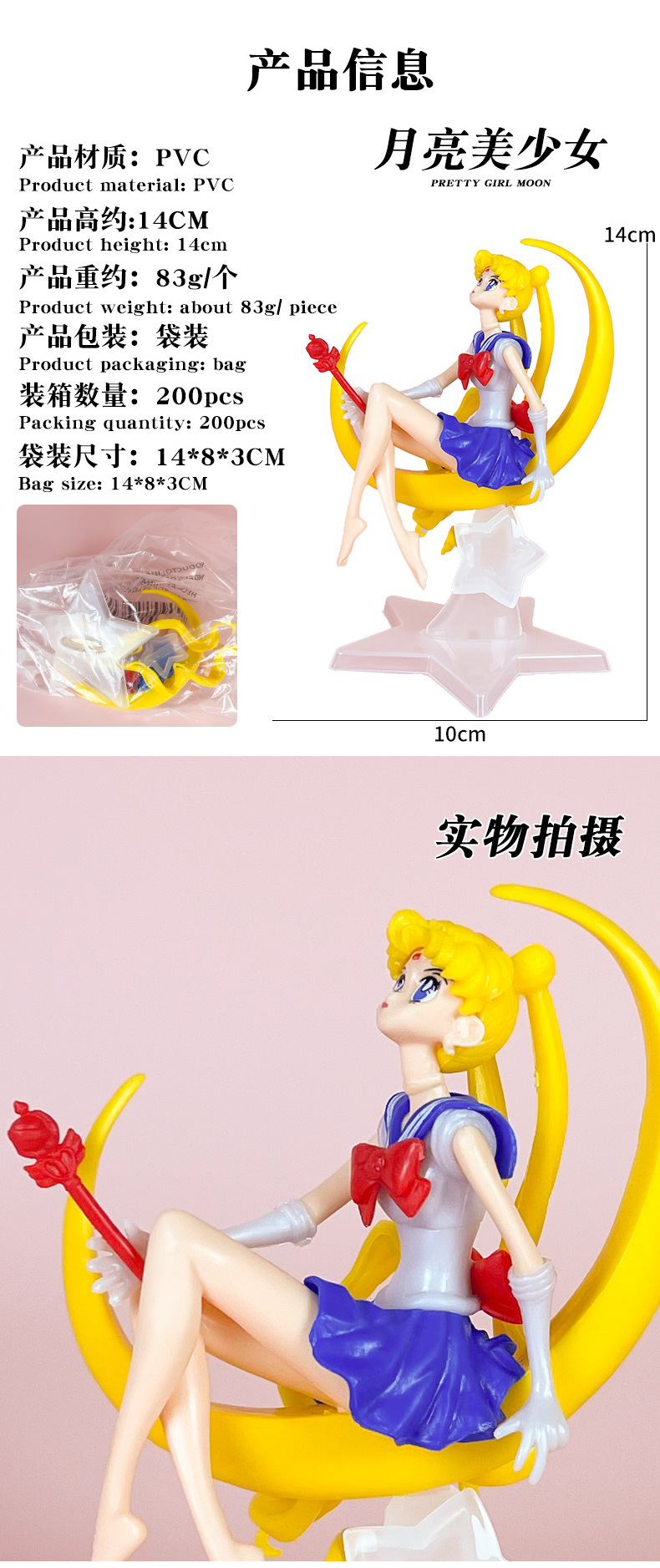 材质: PVC 品牌: 童年 动漫角色: 美少女战士 包装方式: 网袋 规格: 袋装,产品高度约14CM 适用年龄: 青少年(15-17岁) 产地: 大陆 是否有动漫形象: 是 货号: MSN 是否有导购视频: 是 是否拼装: 是 是否专供外贸: 否 3C配置类别: 14岁以上的玩具 颜色: 月亮美少女-透明底座【袋装】 主要下游平台: ebay,亚马逊,wish,速卖通,独立 主要销售地区: 非洲,欧洲,南美,东南亚,北美,东北亚, 是否跨境出口专供货源: 是 重量: 0.001 kg/个