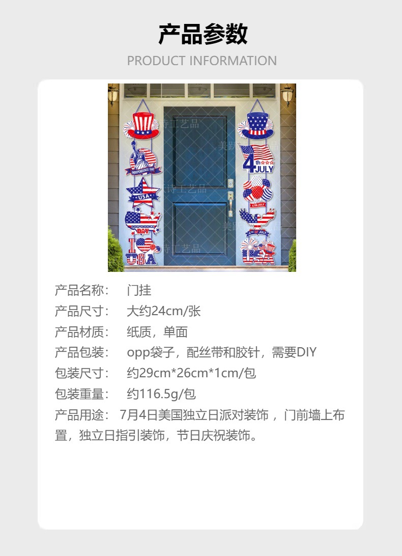材质: 纸 类别: 门挂 品牌: 美跃诗 适用节日: 生日,独立日,其他 风格: 美国 货号: Y-00402 尺寸: 一对/包,Y-00402 是否IP授权: 否 包装: opp袋子,配丝带和点胶,需要DIY 产品用途: 美国独立日派对装饰用品 包装尺寸: 约26*29*1cm/包 重量: 0.001 kg/套