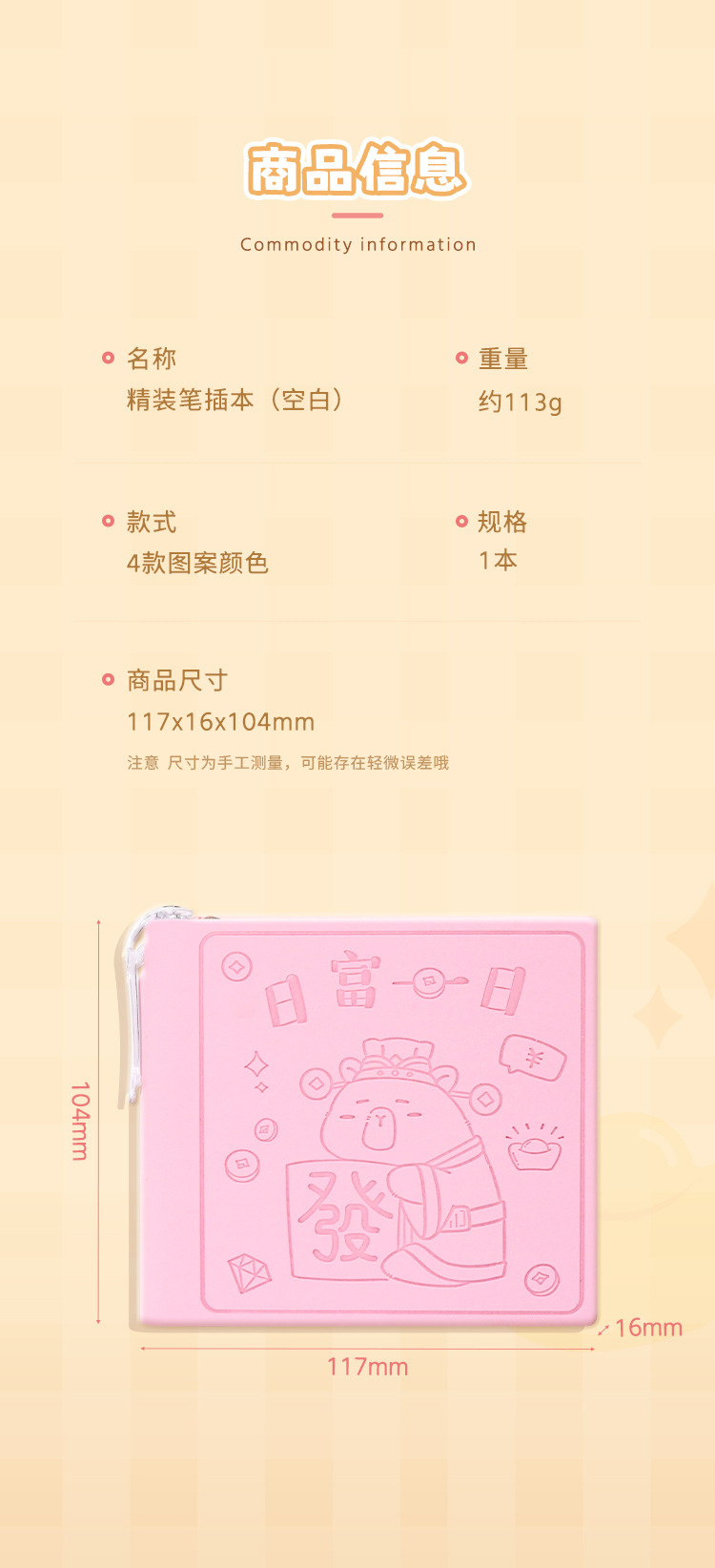 封面材质: EVA软皮 品牌: 晓梦 产品类别: 便携本 装订: 锁线装订 内文纸张克重: 113 笔记本风格: 日韩可爱风 内文纸张页数: 100页-200页(含) 内文材质: 全木浆纸 封面颜色: 单本随机,日富一日,逢考必过,心态超好, 货号: DPBJB-47 重量: 0.14 kg/本