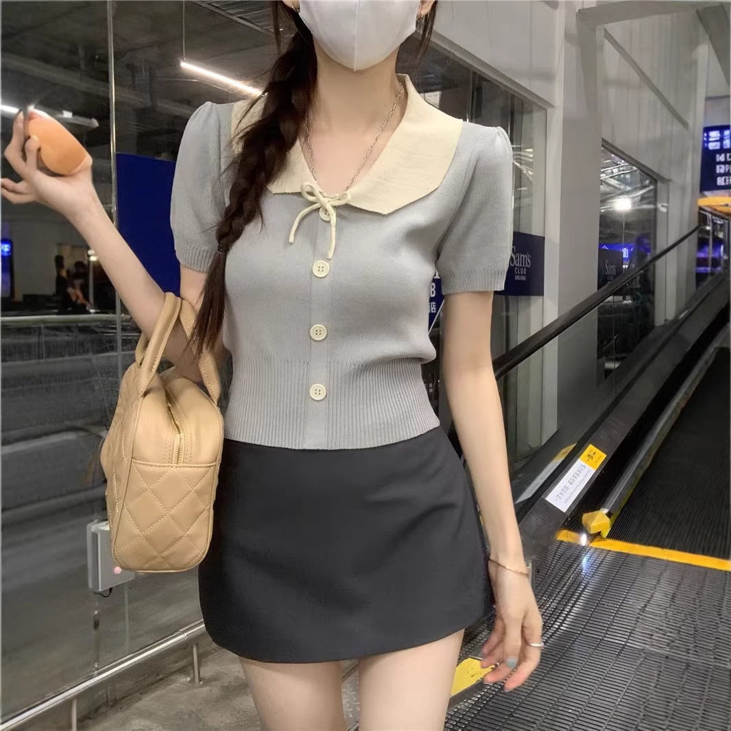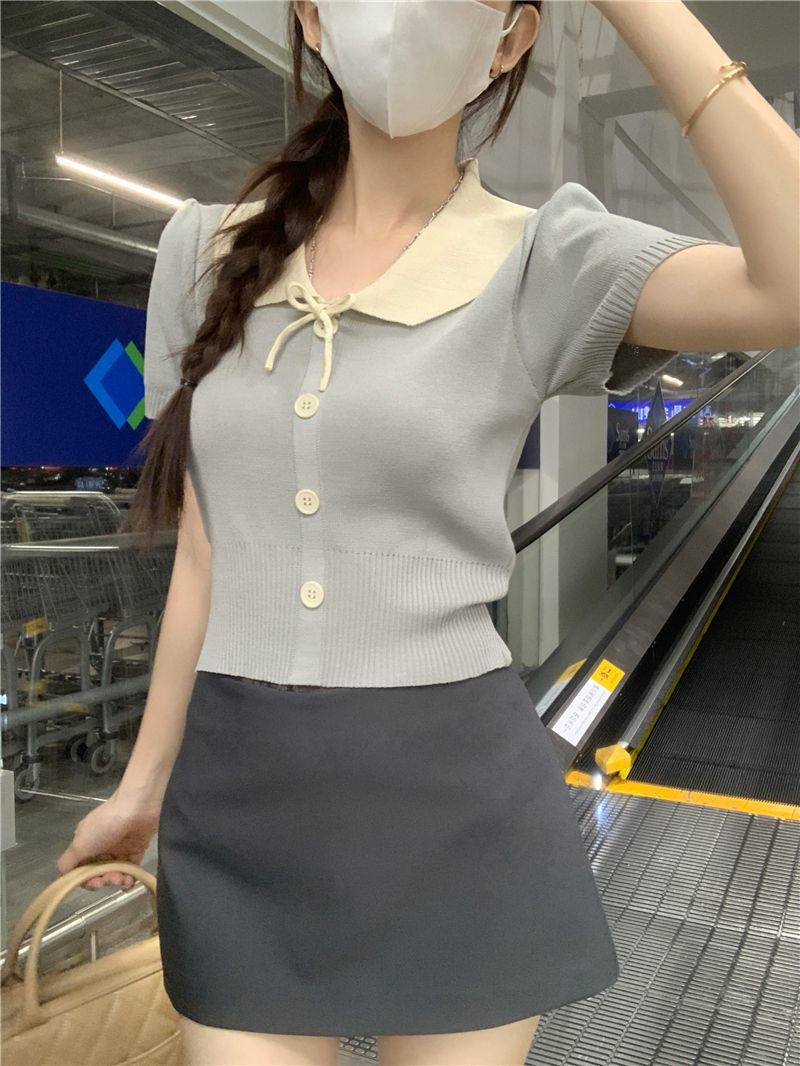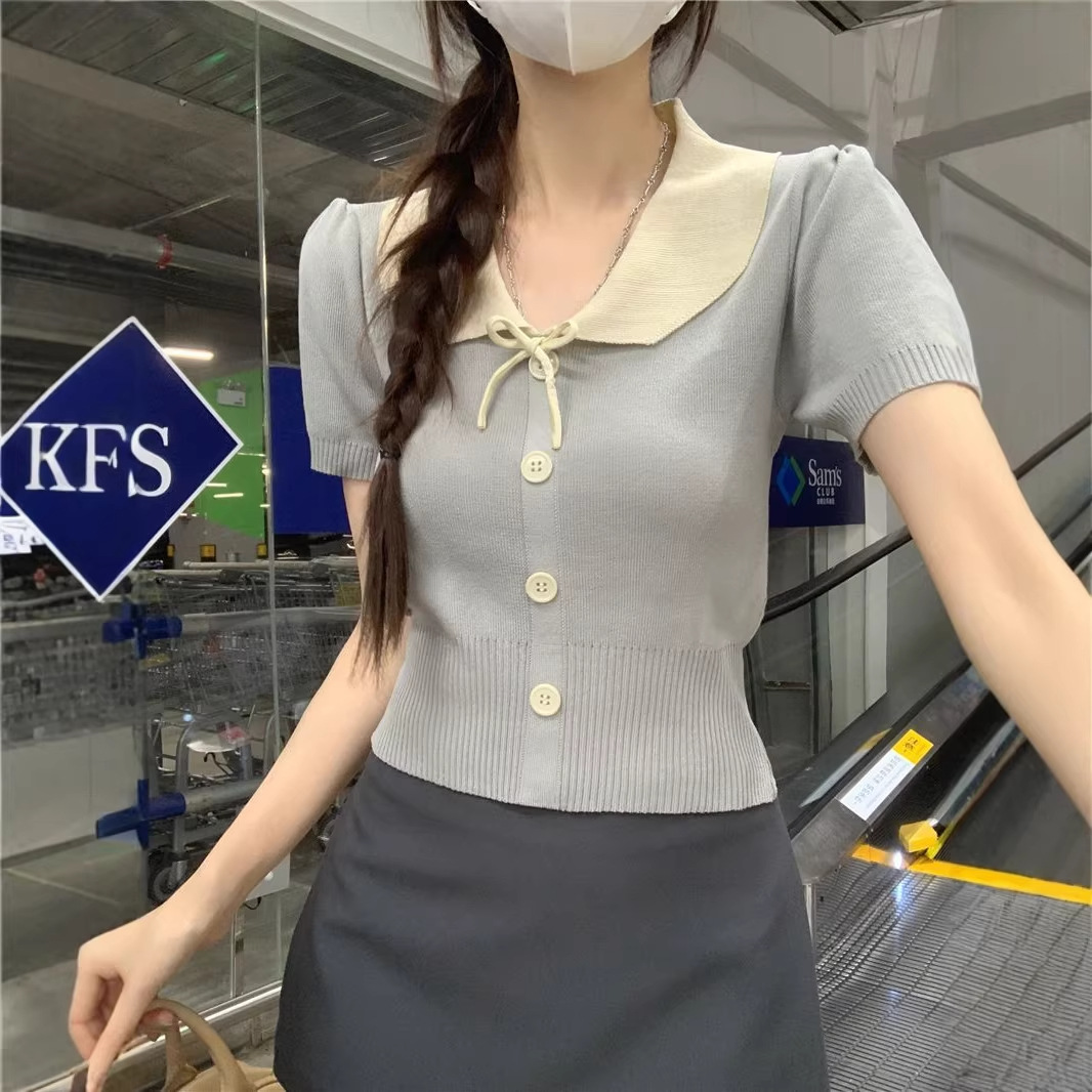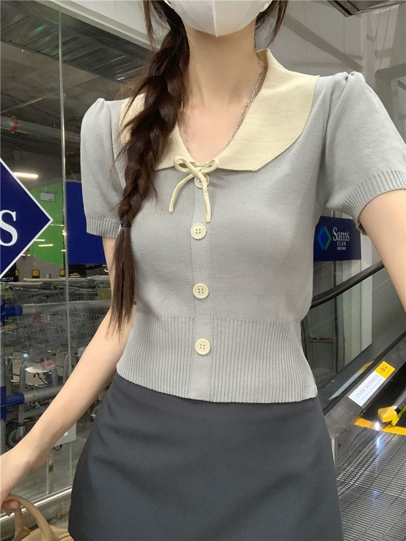 2026年夏新款韩系减龄收腰显瘦拼色娃娃领短款短袖针织开衫上衣女 English | 投诉