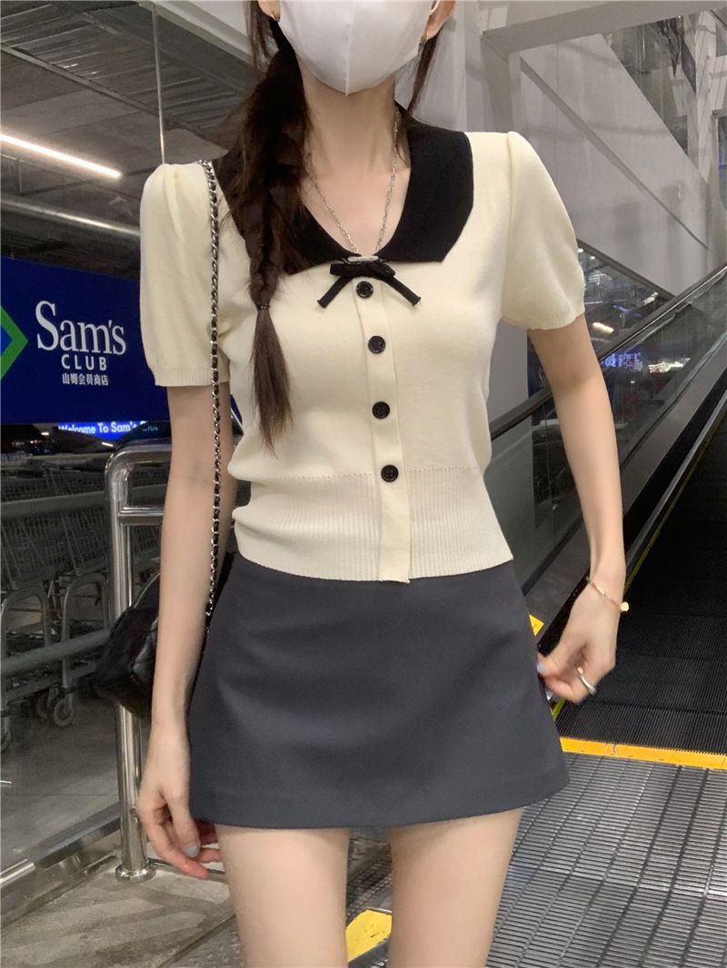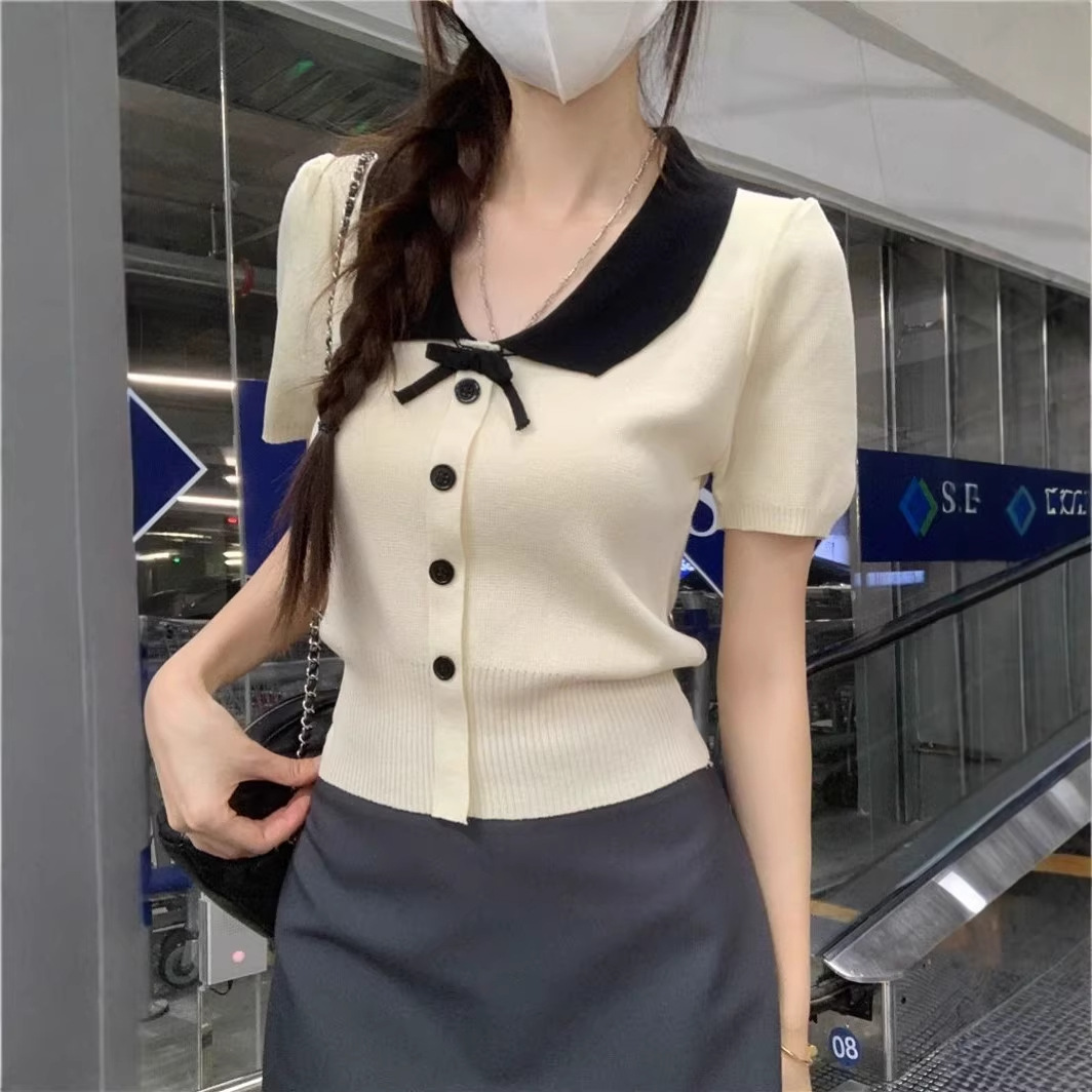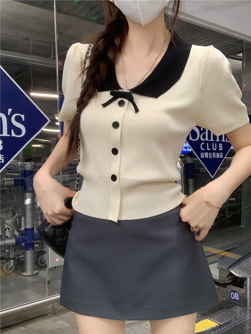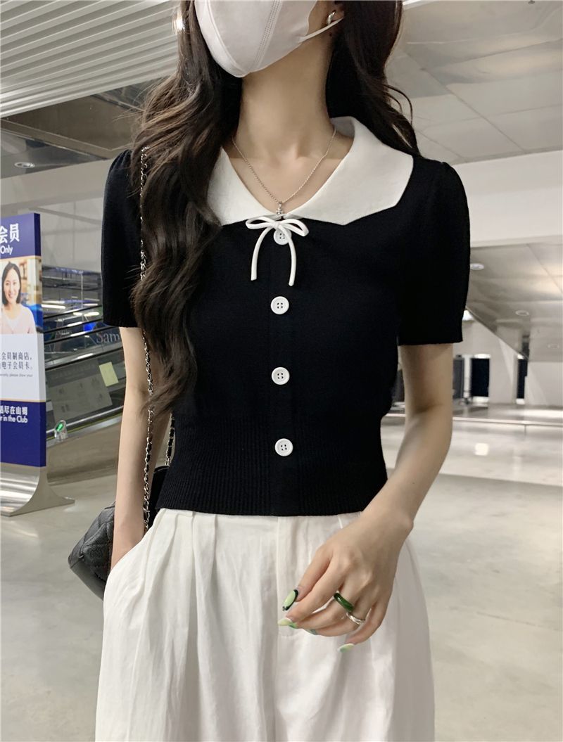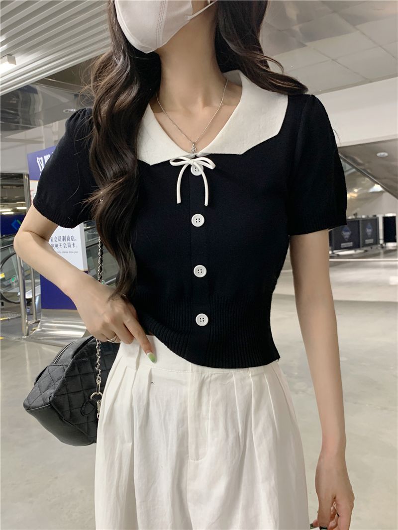 2026年夏新款韩系减龄收腰显瘦拼色娃娃领短款短袖针织开衫上衣女 English | 投诉