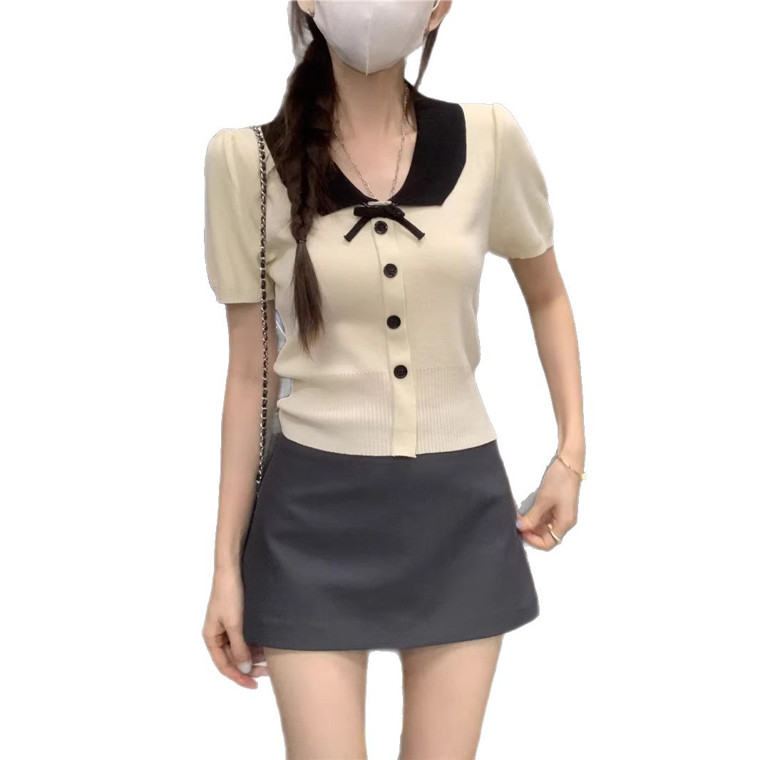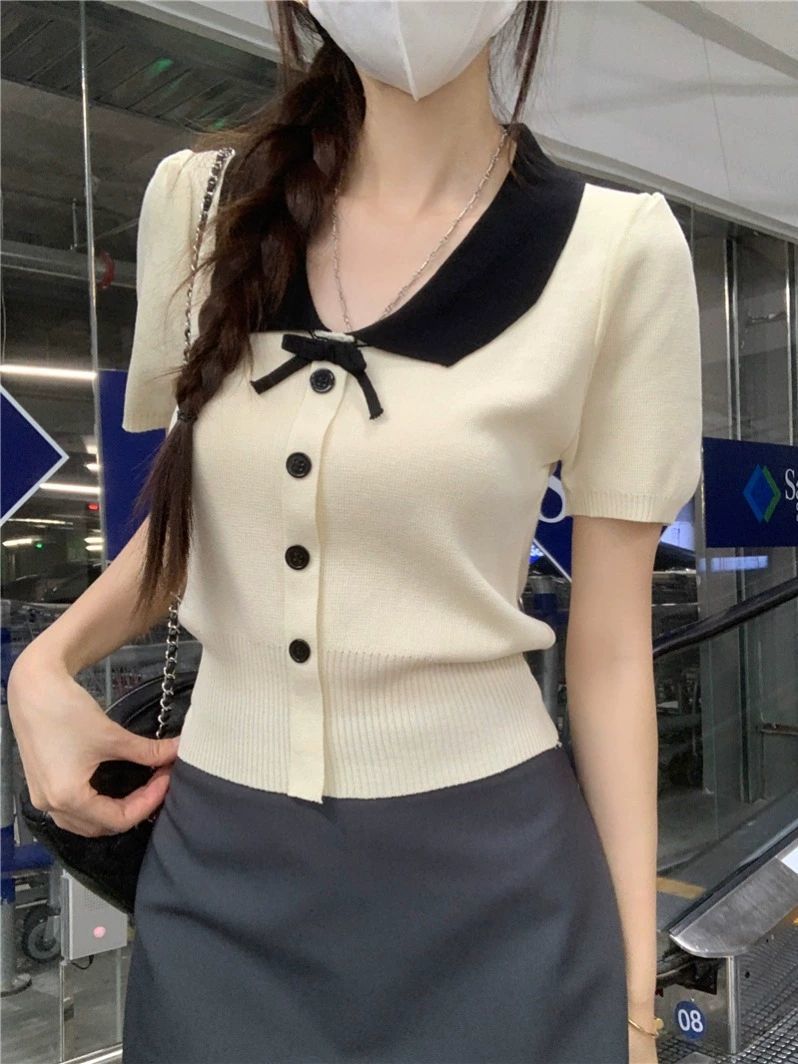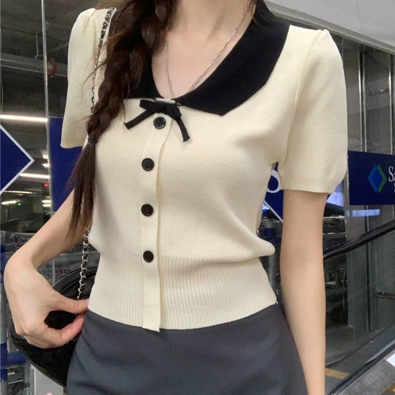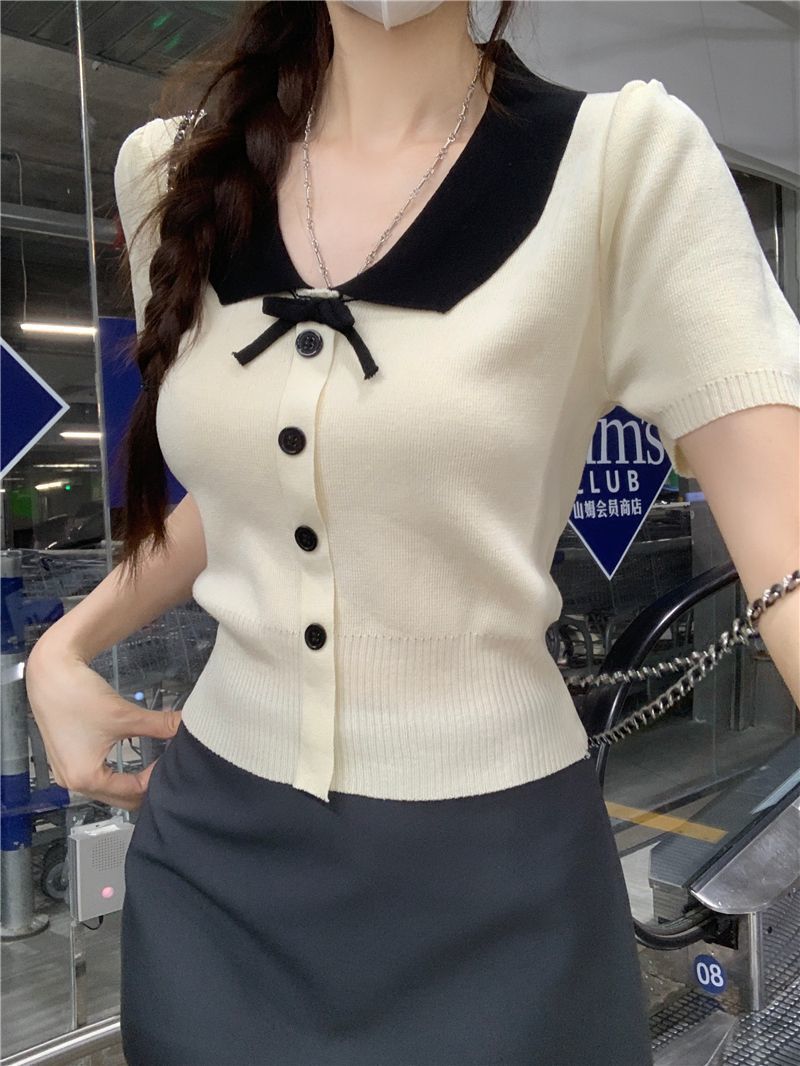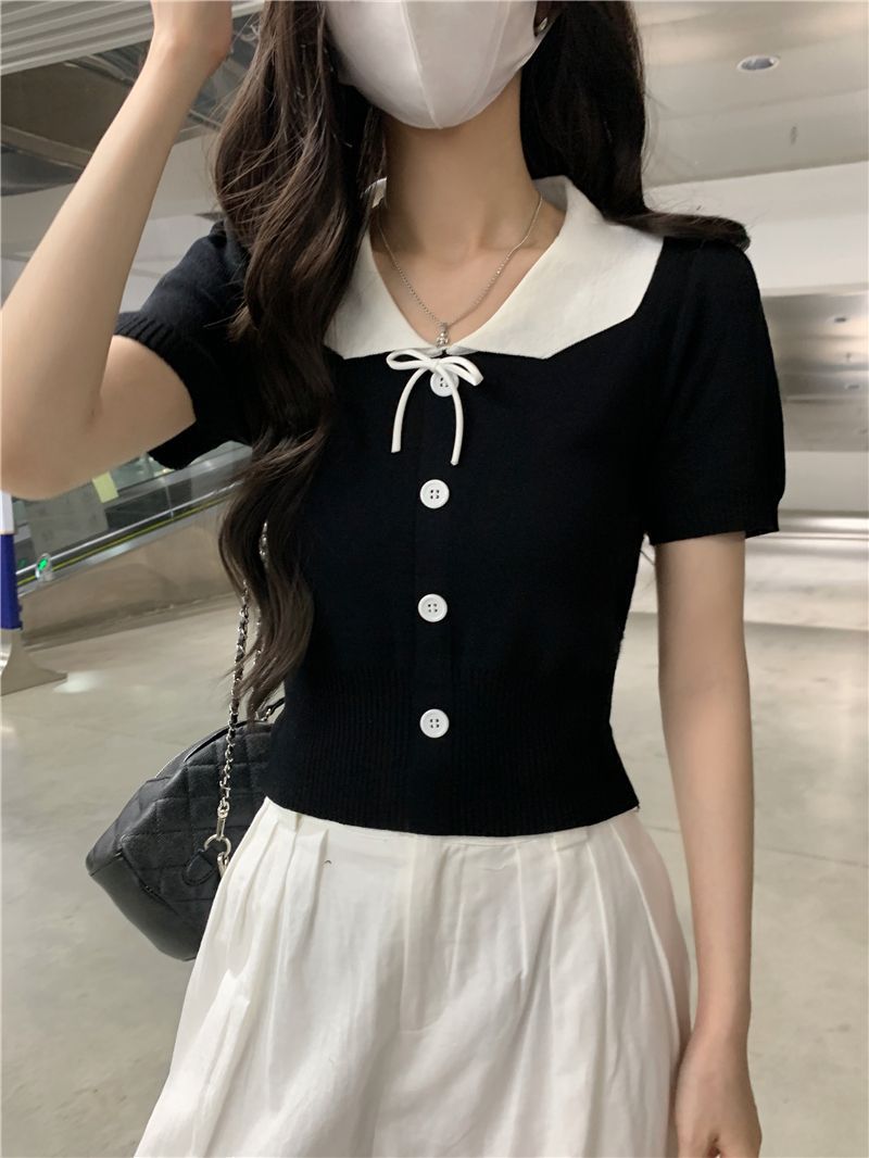 2026年夏新款韩系减龄收腰显瘦拼色娃娃领短款短袖针织开衫上衣女 English | 投诉
