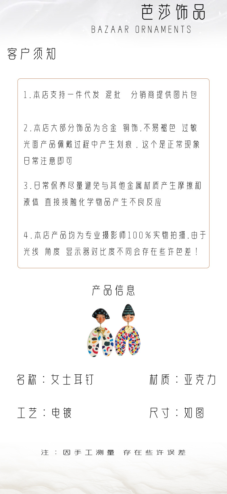 材质: 亚克力 处理工艺: 环保电镀 耳针材质: 不锈钢 品牌: 芭莎 流行元素: 圆形,环形 风格: 欧美风 生产编号: EH4714 销售序列号: EH4714 造型: 卡通人物 货号: EH4714 产地: 金华 主要下游平台: 京东,ebay,PDD,亚马逊,wish 颜色: EH4714 有可授权的自有品牌: 是 是否跨境出口专供货源: 是 上市年份/季节: 2026年春季 风格分类: 时尚通勤 主要销售地区: 非洲,欧洲,南美,东南亚,北美,东北亚, 适用人群: 女式 商品类型: 饰品 重量: 0.001 kg/对