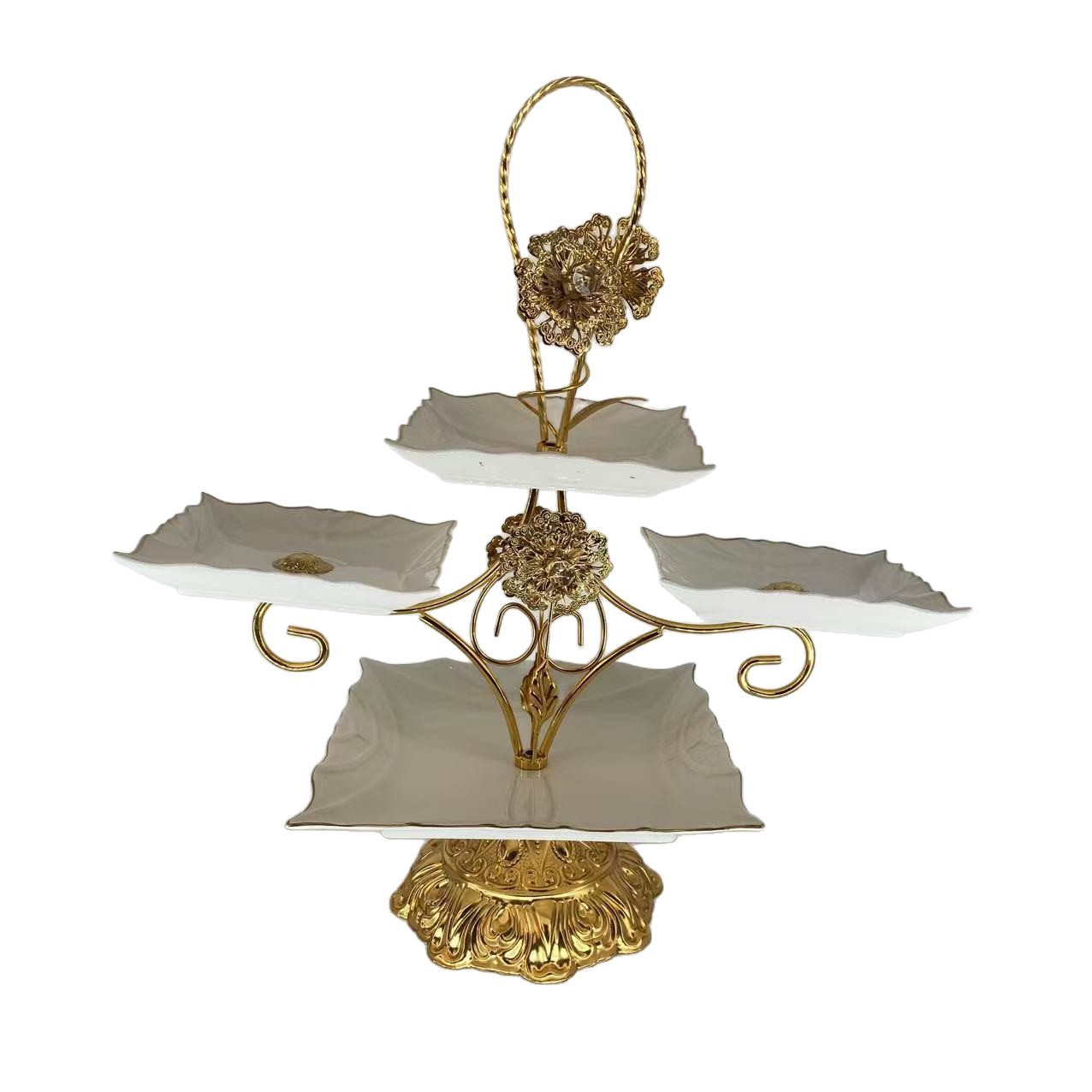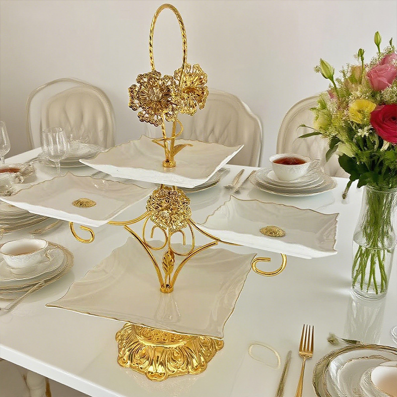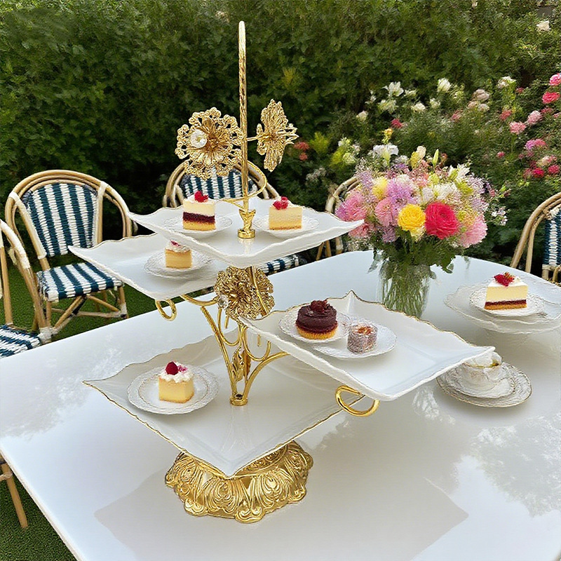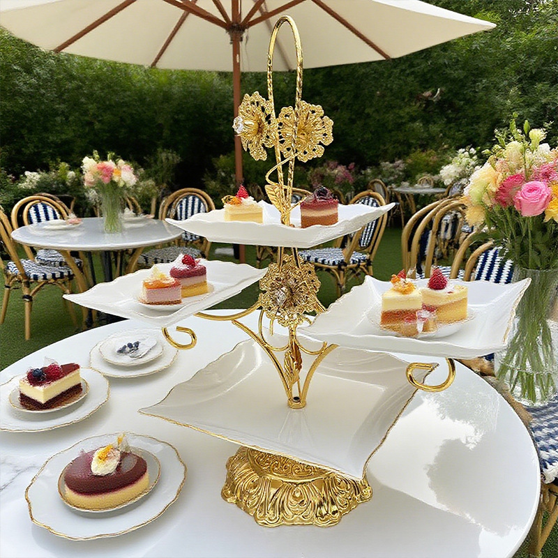 跨境北美创意多层甜品架金色雕花镂空设计酒店室外下午茶精致摆盘