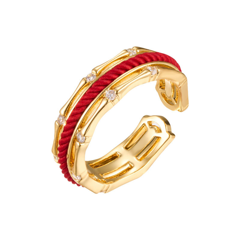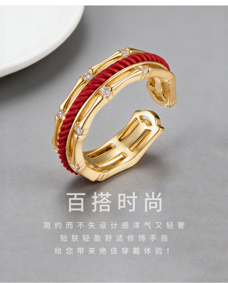 轻奢国风红绳竹节开口戒指铜合金真金电镀镶锆石可调节食指戒指环