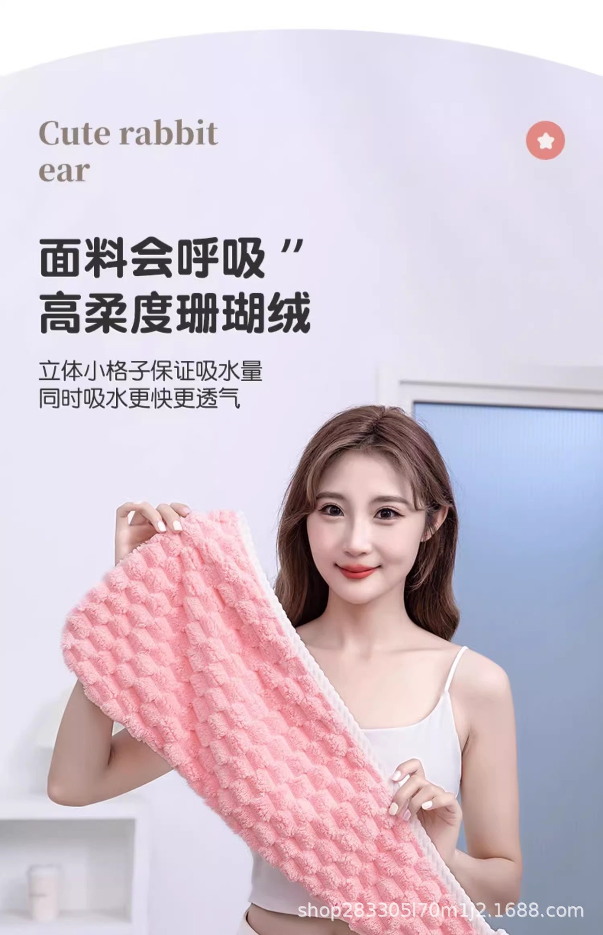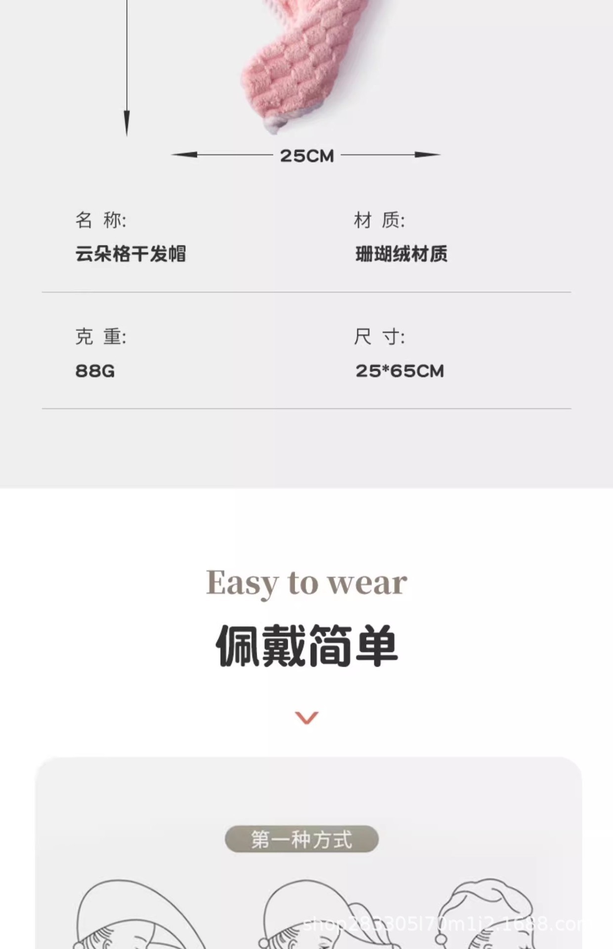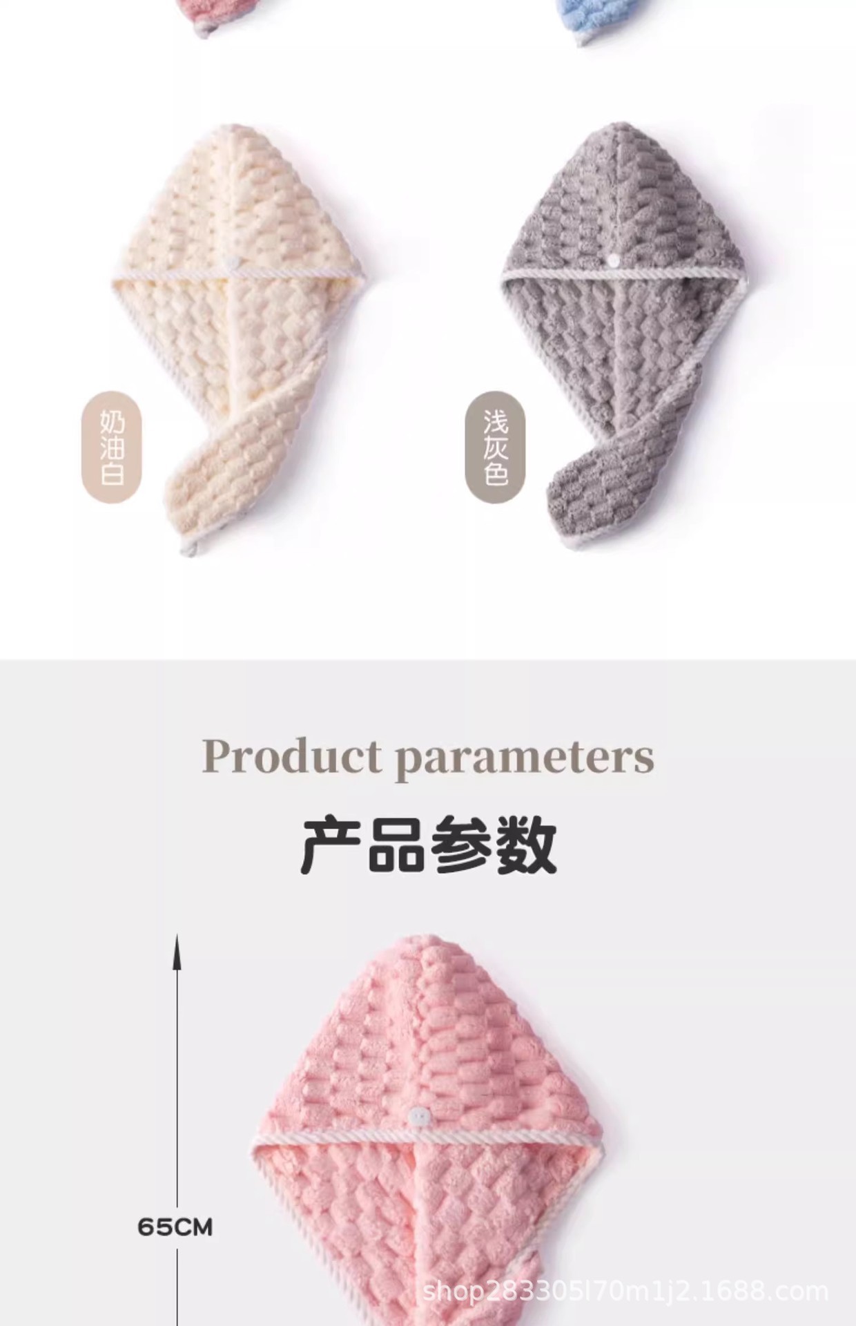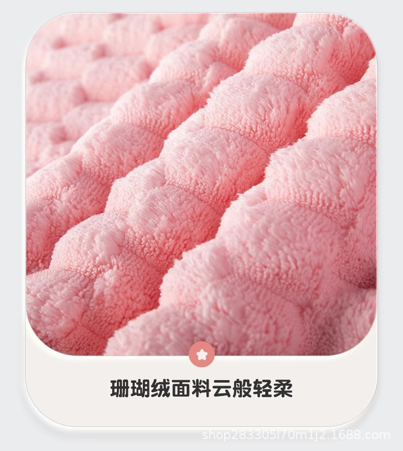 材质: 珊瑚绒 克重: 80-99G 品牌: 冀福 制作工艺: 包边 纱线规格: 21支 货号: 云朵绒干发帽 加工定制: 否 颜色: 粉红色,米白色,浅蓝色,灰色 规格(长*宽cm): 65*25
