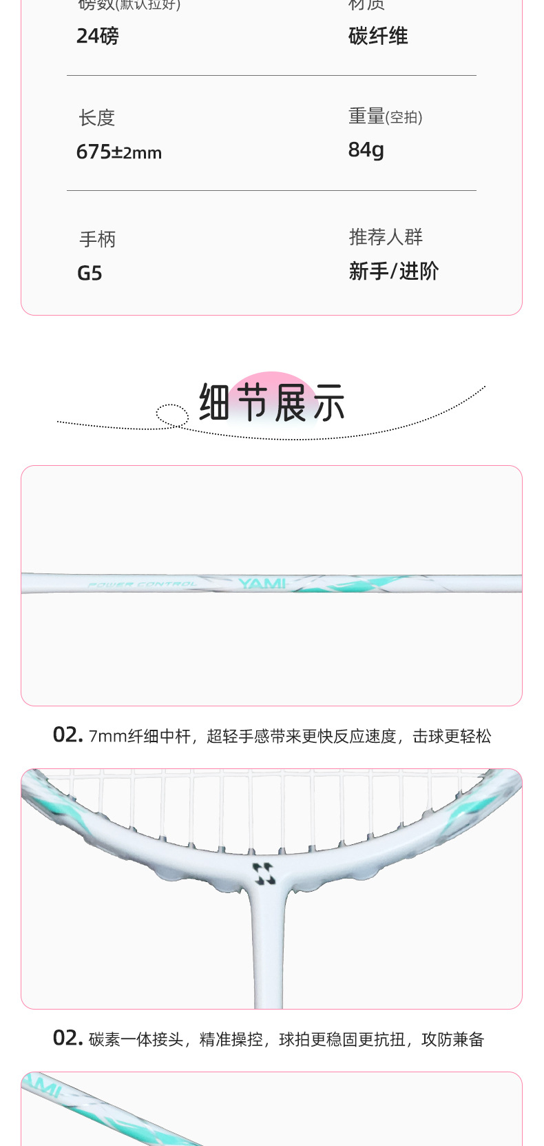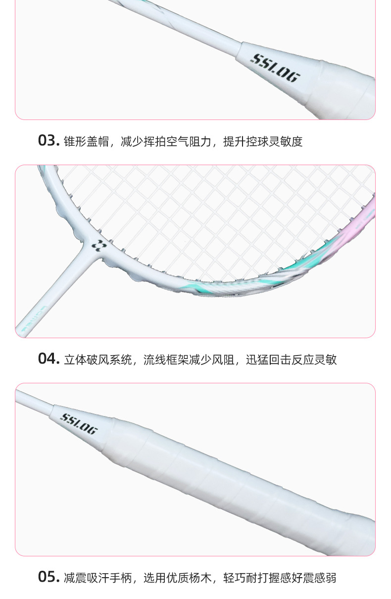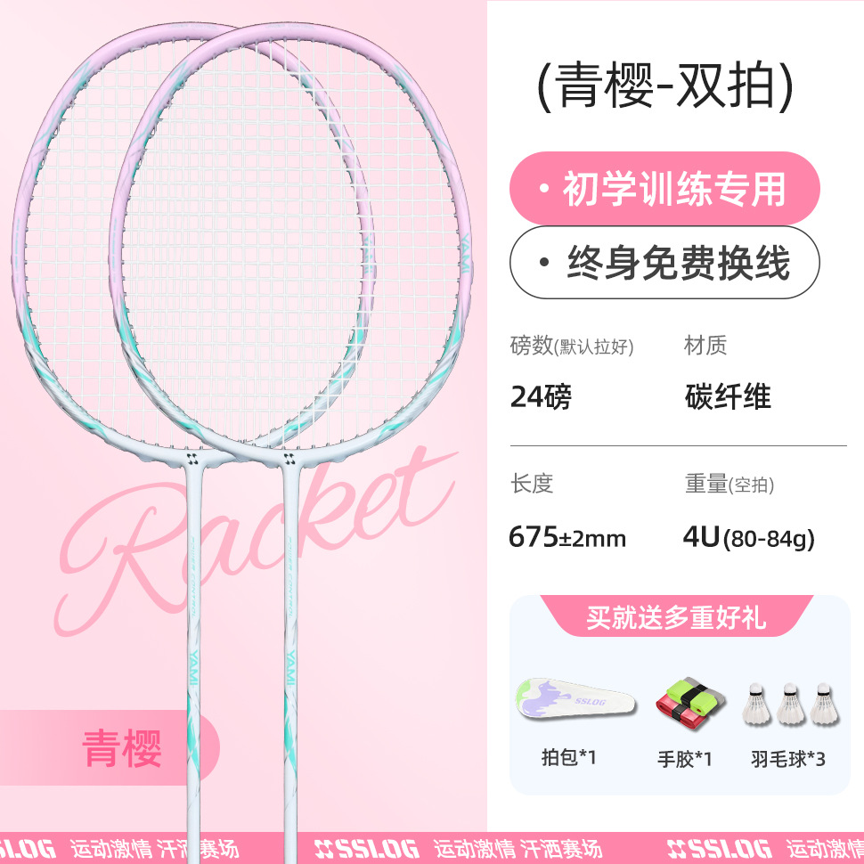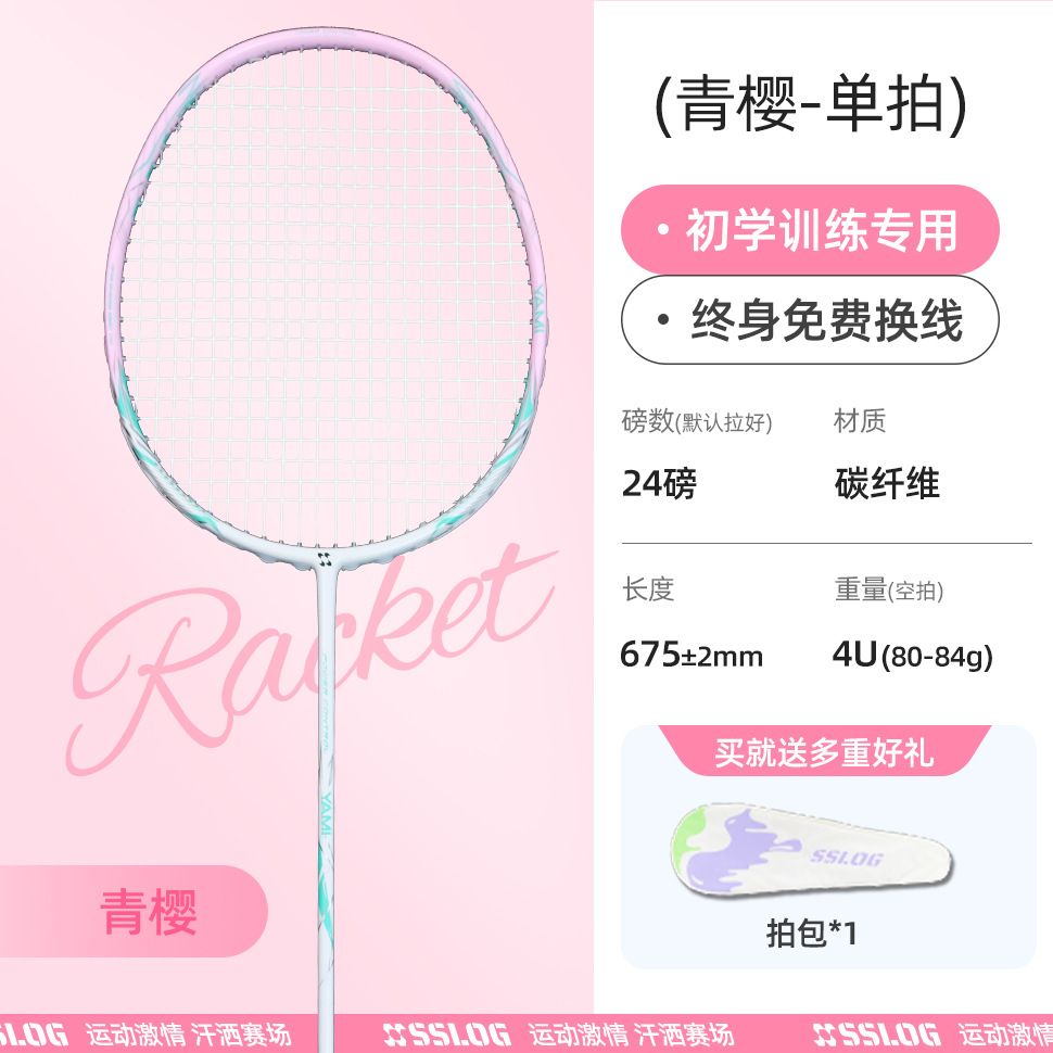品牌: 赛狮龙 框架材质: 碳素纤维 产品类别: 羽毛球拍 网线材质: 纤维丝 球拍类型: 直拍 重量: 80g(含)-84g(含) 拍杆硬度: 适中 规格: 一支 货号: qt-05 产地: 浙江杭州 加工定制: 是 加印LOGO: 不可以 适用对象: 业余初中级 拍柄粗细: G5 适用场景: 健身器材,运动户外包类,乒羽网球运动 颜色: 【4U进阶首选】青樱送拍包,【4U进阶首 是否跨境出口专供货源: 否 儿童专用: 否 专利类型: 无 外贸出口认证: 其他