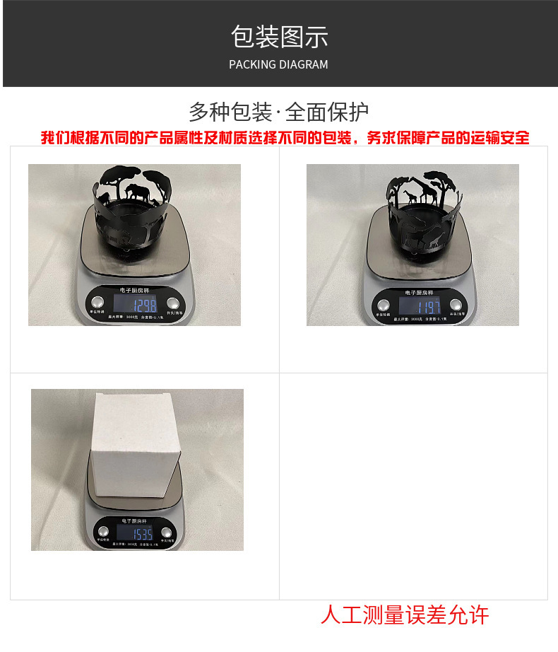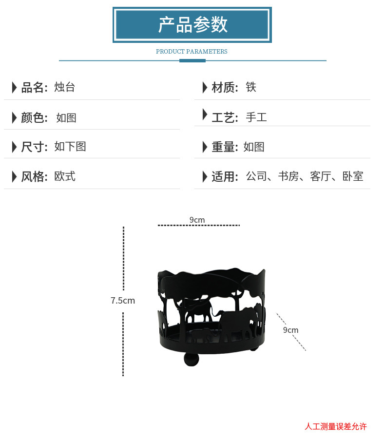 材质: 铁 器皿种类: 烛台 工艺: 电镀 包装: 纸盒装 品牌: 羿博 产品编号: 1257 货号: 圆形铁烛台 是否专利货源: 否 是否进口: 否 尺寸: 大象A,长颈鹿B 主要下游平台: 亚马逊,wish,独立站 主要销售地区: 非洲,欧洲,东南亚,北美,东北亚 有可授权的自有品牌: 否 是否跨境出口专供货源: 是 是否属于礼品: 是,商务礼品 送礼用途: 商务礼品,广告礼品,会议礼品,福利礼品, 是否IP授权: 否 重量: 0.001 kg/个