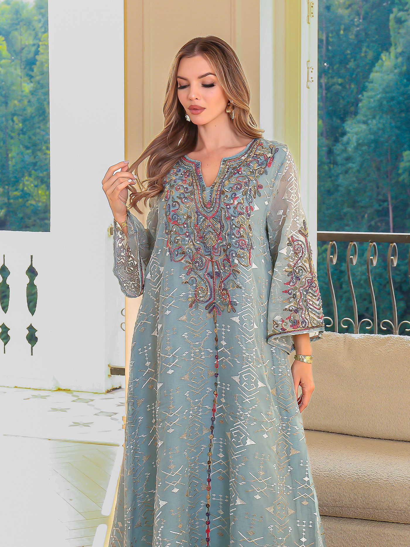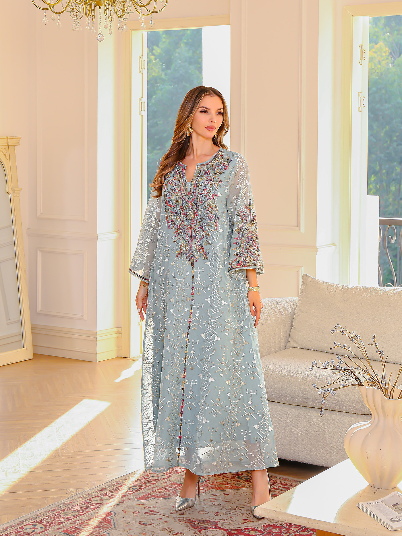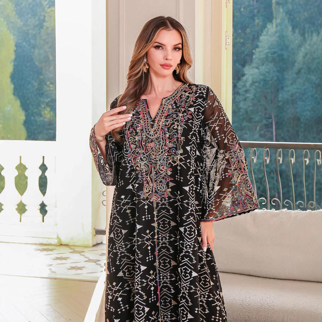 跨境中东穆斯林长袍 刺绣女长裙 迪拜abaya女士绳绣连衣裙现货