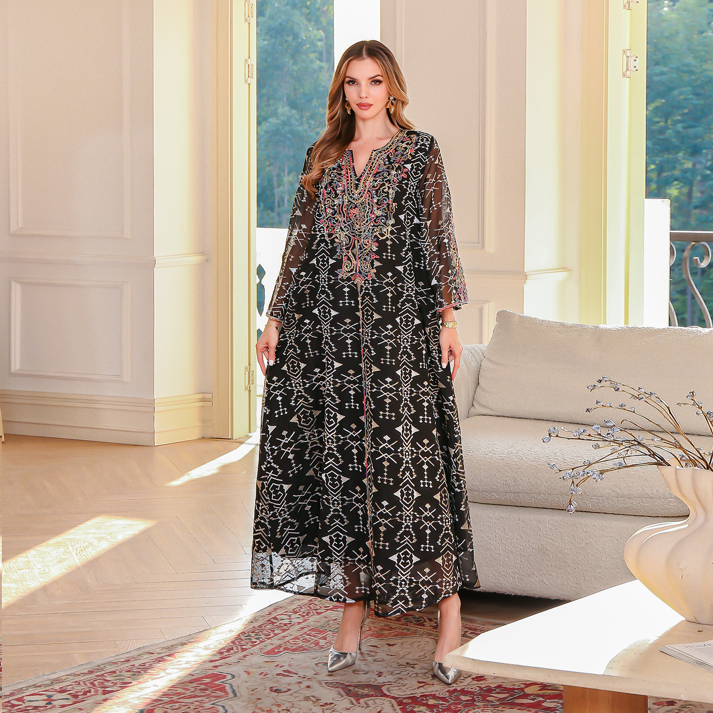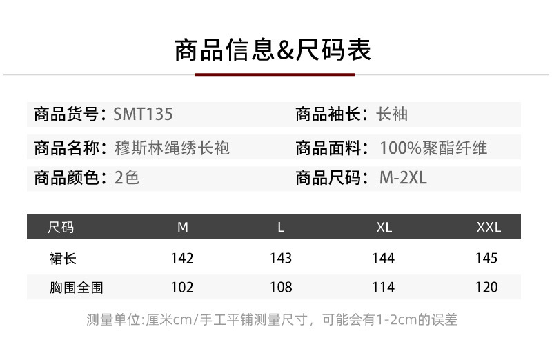 面料名称: 涤纶 主面料成分: 涤纶(聚酯纤维) 工艺: 刺绣/绣花 品牌: 其他 上市年份/季节: 2025年 流行元素: 其他 主面料成分2: 涤纶(聚酯纤维) 货号: SMT135 颜色: 黑色 尺码: M,L,XL,XXL 主面料成分含量: 70%(含)-80%(不含) 裙长: 长裙 袖型: 常规袖 名称2: abaya 名称1: 穆斯林 版型: 标准型 货源类型: 源头工厂 吊牌: 无吊牌 主要下游销售地区1: 中东 适用体型: 通用型 重量: 0.001 kg/件