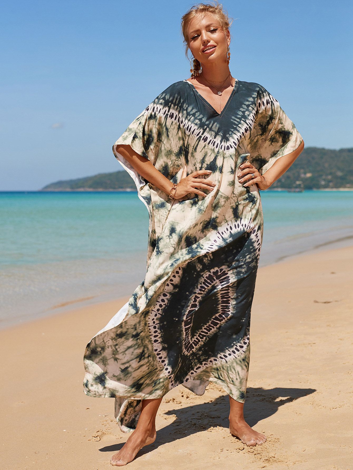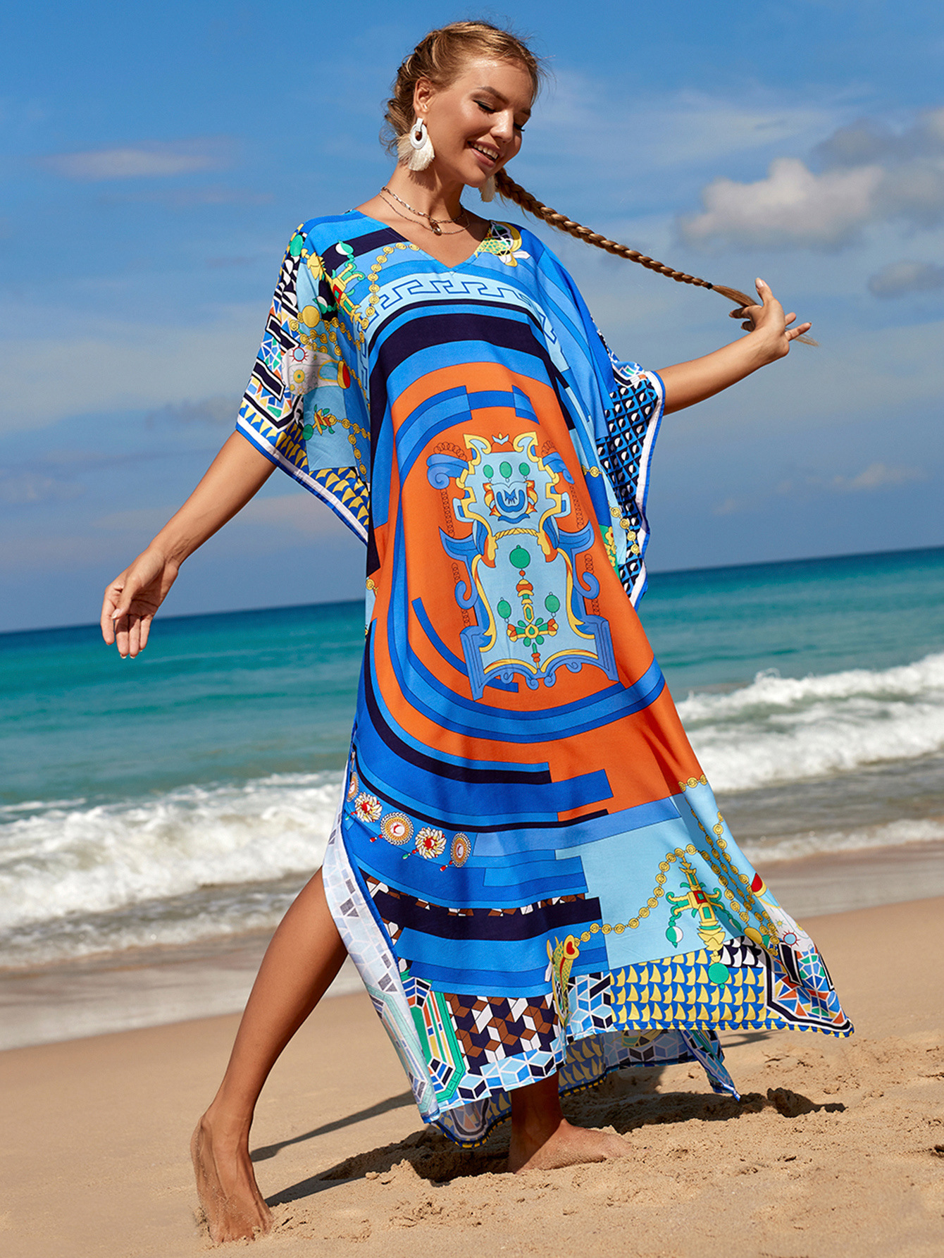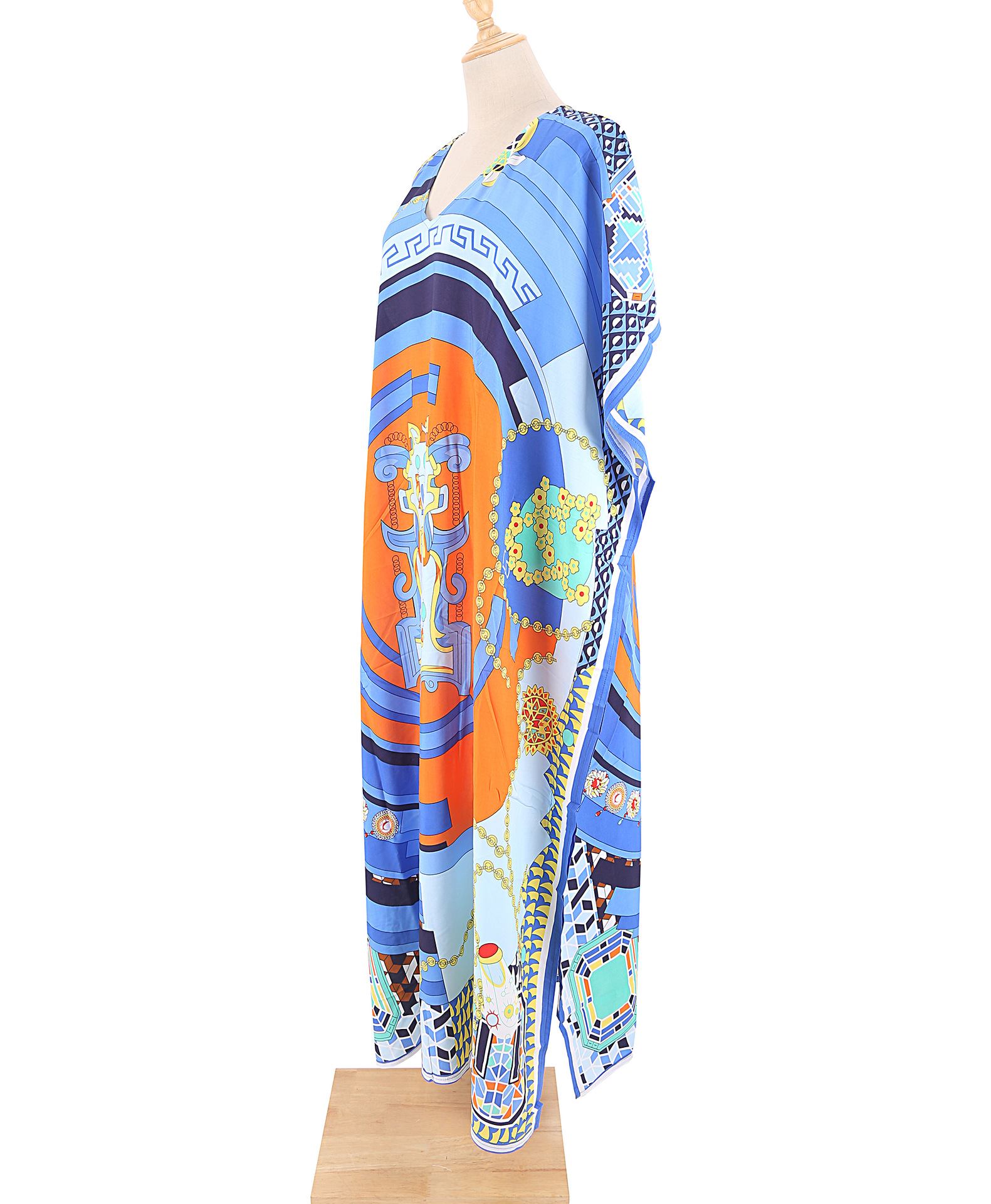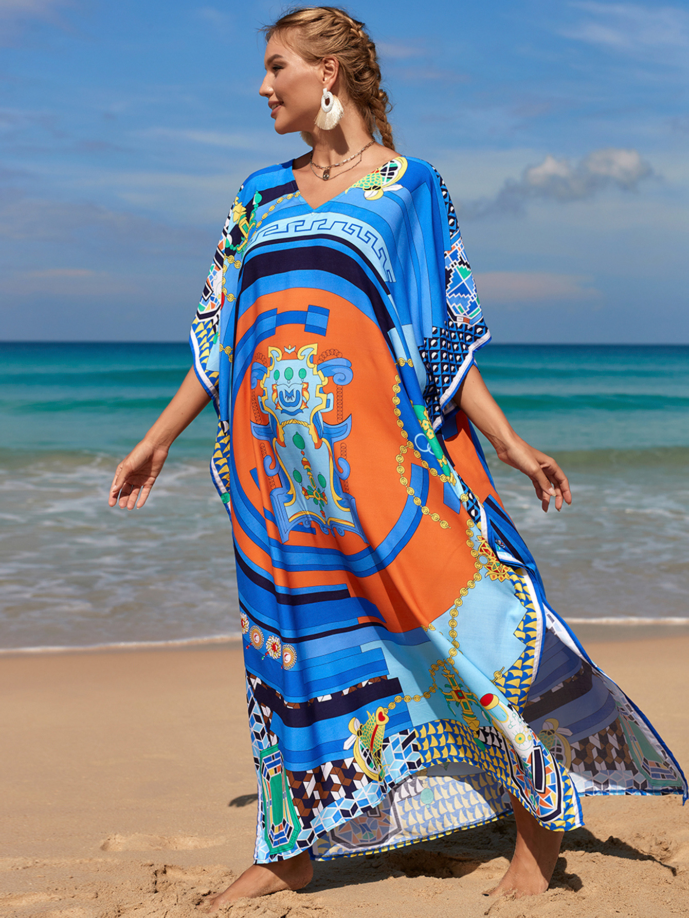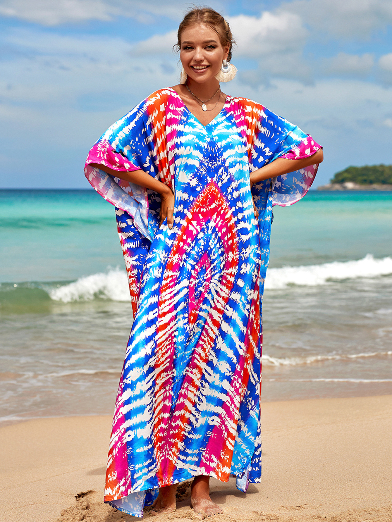 欧美新款人棉印花沙滩裙宽松长袍海边度假比基尼泳衣罩衫防晒衫女 English | 投诉
